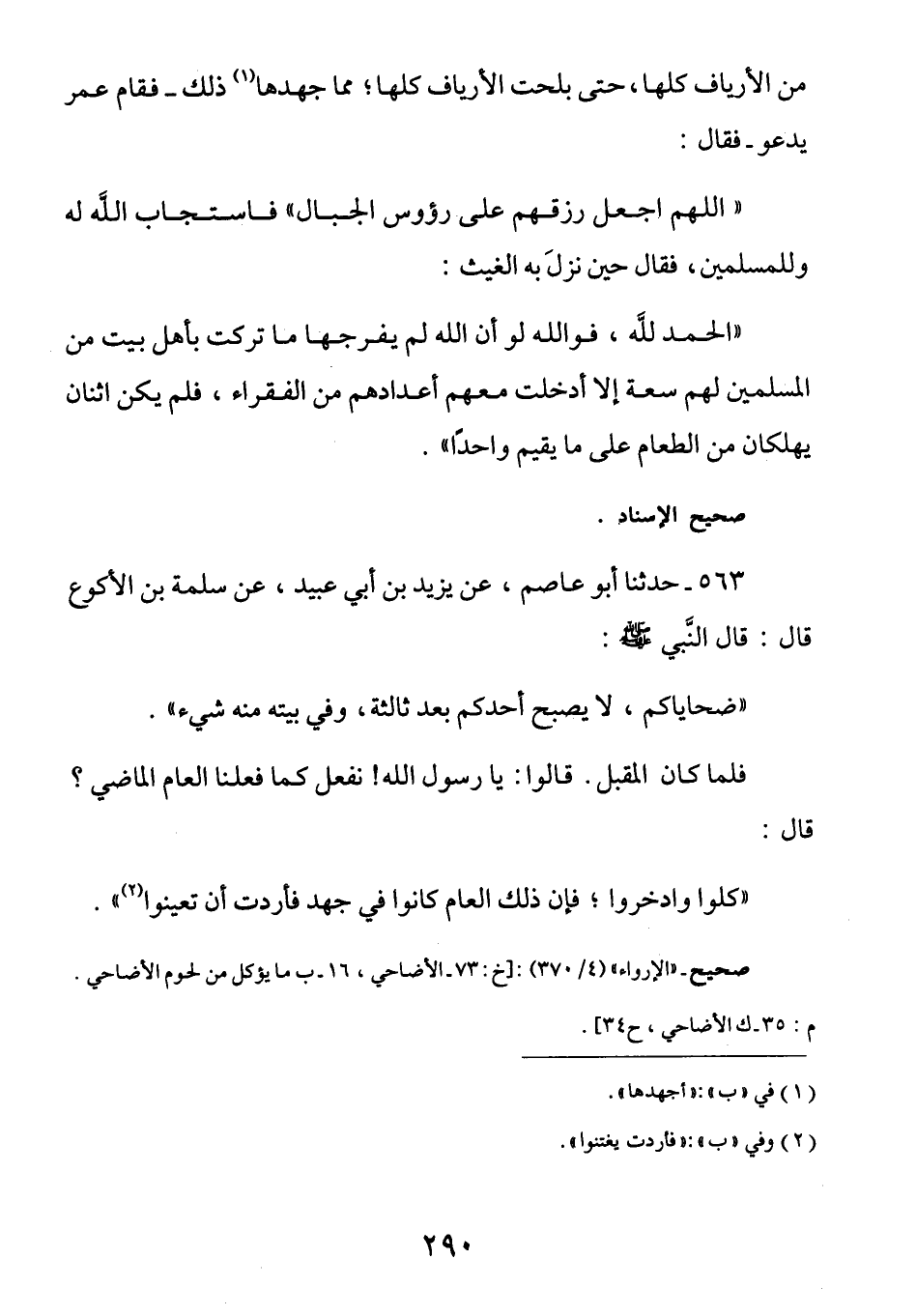 563 - عن سلمة بن الأكوع رضي الله عنه قَالَ: قَالَ النَّبِيُّ صَلَّى اللهُ عَلَيْهِ وَسَلَّمَ ك (ضَحايَاكُم لَا يُصبحُ أَحدُكُم بَعد ثَالثةٍ وفِي بَيته مِنه شَيءٍ،) فَلما كَانَ العامُ المُقبلُ قَالوا يَا رَسُولَ اللَّهِ نَفعل كَما فَعلنا العَام الْمَاضِيَ؟ قَالَ: (كُلوا وادَّخِروا فَإن ذَلكَ العَامَ كَانُوا فِي جَهدٍ فَأردتُ أَنْ تًعينُوا) .