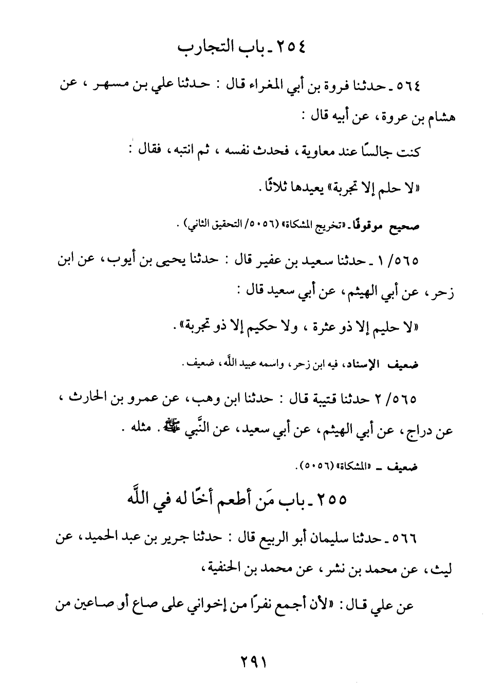 564 - (ث 138) عن عروة بن الزبير رضي الله عنهما قَالَ: كُنتُ جَالِسًا عِند مُعاوية، فَحدثَ نَفسه ثُم انتَبَه فَقال: لَا حِلم إِلَّا تَجْرُبَهٌ. يُعيدُها ثلاثاً