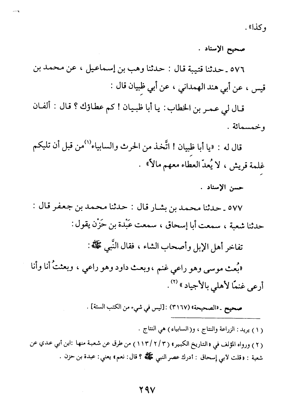 577 - (ث 143) عن عبدة بن حزن قال: تَفاخَر أَهلُ الإبلِ وأصحابُ الشَّاءِ، فَقَالَ النَّبِيُّ صَلَّى اللهُ عَلَيْهِ وَسَلَّمَ: (بُعِث مُوسى وهُو راعي غَنمٍ، وبُعِث دَاود وهُو راعي غَنَمٍ وبُعثتُ أنَا وأنَا أرعَى غَنماً لأهلِي بأجيَاد) .