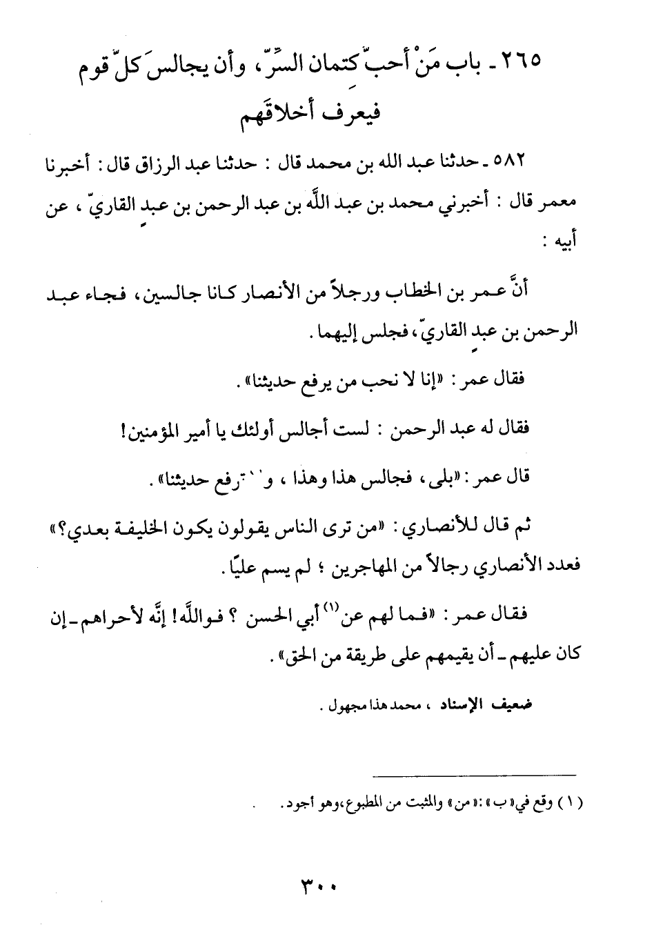 582 - (ث 146) عن مُحَمَّدُ بْنُ عَبْدِ اللَّهِ بْنِ عَبْدِ الرَّحْمَنِ بْنِ عَبْدٍ الْقَارِيِّ عَنْ أَبِيهِ أَنَّ عُمَرَ بْنَ الْخَطَّابِ وَرَجُلًا مِن الْأَنْصَارِ كَانا جَالسينِ فَجاء عَبْدُ الرَّحْمَنِ بْنُ عَبْدِ الْقَارِيِّ فَجَلس إِليهما فَقال عُمَرُ: إنَّا لَا نُحب مَن يَرفع حَديثنا. فَقَالَ لَه عَبْدُ الرَّحْمَنِ لَستُ أُجَالِسُ أُولَئِكَ يَا أَمِيرَ الْمُؤْمِنِينَ. قَالَ عُمَرُ: بَلى فَجالِس هَذا وهَذا وَلَا تَرفع حَديثَنا، ثُم قَال لِلْأَنْصَارِيِّ مَن تَرى الناسَ يَقولون يَكون الخَليفةُ بَعدي. فَعددَّ الْأَنْصَارِيُّ رِجَالًا مِن المُهاجِرين لَم يسمِّ عَلِيًّا فَقال عُمَرُ: فَما لَهم عَنْ أَبِي الحَسن فَوالله إنَّه لأحرَاهُم - إنْ كَانَ عَلَيْهِمْ - أنْ يُقِيمَهُم عَلى طَريقةٍ مِن الحَق.