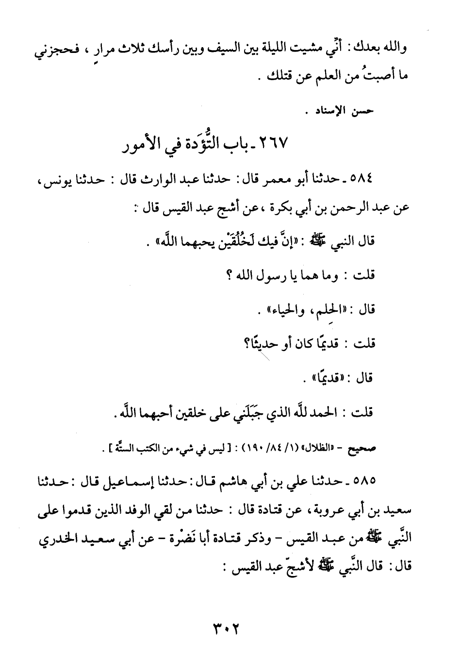 584 - عن أشج عبد القيس رضي الله عنه قال: قال لي النبي صلى الله عليه وَسَلَّمَ: (إنَّ فِيك لَخُلقَين يُحبُهما اللَّهُ) قُلتُ ومَا هُما يَا رَسُولَ اللَّهِ؟ قَالَ: (الحِلمُ والحَياءُ) قُلت قَديماً كَانَ أَوْ حَديثاً قَال: (قَديماً) قُلت الْحَمْدُ لِلَّهِ الَّذِي جَبَلنِي عَلى خُلقَين أُحبَّهُما الله