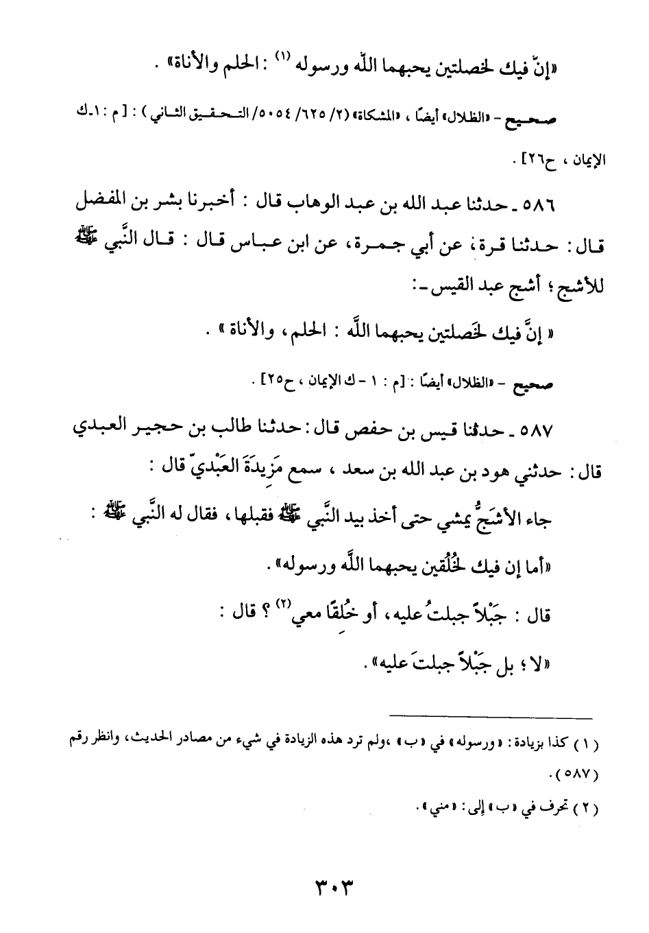 586 - عن أبي جمرة عن ابن عباس رضي الله عنه قَالَ: قَالَ النَّبِيُّ صَلَّى اللهُ عَلَيْهِ وَسَلَّمَ: (للأشجِ أَشجِ عَبد القَيس: إنَّ فِيكَ لَخصلَتين يُحبُهما الله الحِلم والأنَاة)