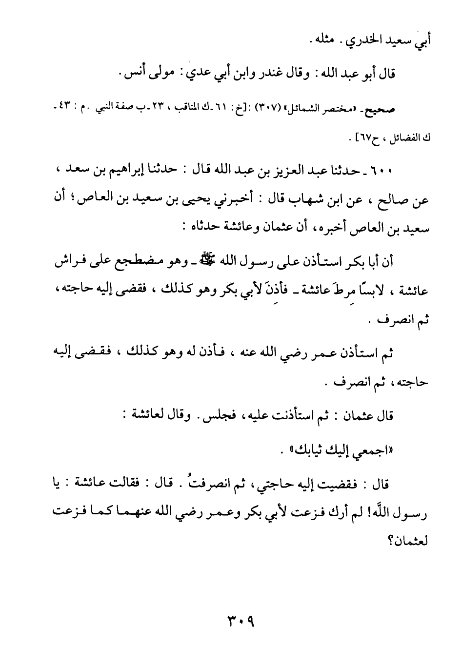 600 - عن عثمان وعائشة رضي الله عنهمالاأن أبا بكر رضي الله عنه اسْتَأْذَنَ عَلَى رَسُولِ اللَّهِ صَلَّى اللهُ عَلَيْهِ وَسَلَّمَ وَهُوَ مُضطَجِعٌ عَلى فِراش عَائشة لَابِسًا مُرط عَائشة فَأذن لِأَبِي بَكر وهُو كَذلك فَقضَى إِلَيْهِ حَاجتَهُ ثُم انْصَرَفَ، ثُم اسْتَأْذَنَ عُمر رَضِيَ اللَّهُ عَنْهُ فَأذن لَه وهُو كَذلك فَقضى إِلَيْهِ حَاجتَهُ ثُم انْصَرَفَ، قَالَ عُثْمَانُ: ثُم استَأذَنت عَليه فَجلس وقَال لِعائشةَ: (اجمَعي إِلَيْكِ ثِيابَك) قَالَ: فَقضيتُ إِلَيْهِ حَاجَتي ثُم انصرفتُ قَالَ: فَقَالَتْ عَائِشَةُ: يَا رَسُولَ اللَّهِ لَم أرَك فَزِعت لِأَبِي بكرٍ وَعُمَرَ رَضِيَ اللَّهُ عَنْهُمَا كَما فَزِعت لعُثمان؟