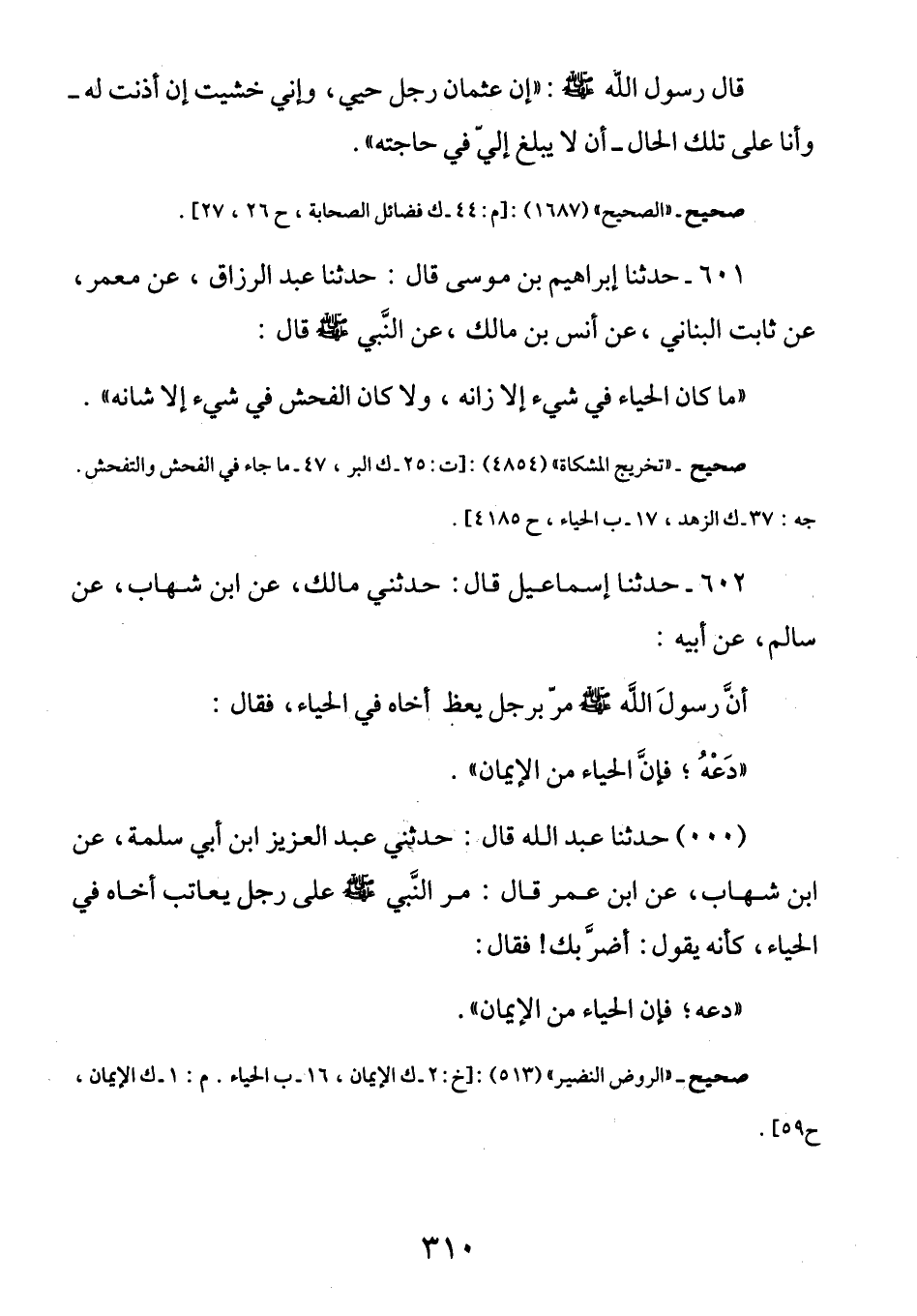 صحيح ـ «الروض النضير» (513) : [خك 2ـ ك الإيمان ,16 ـ ب الحياء. م: 1ـ ك الإيمان , ح 59]