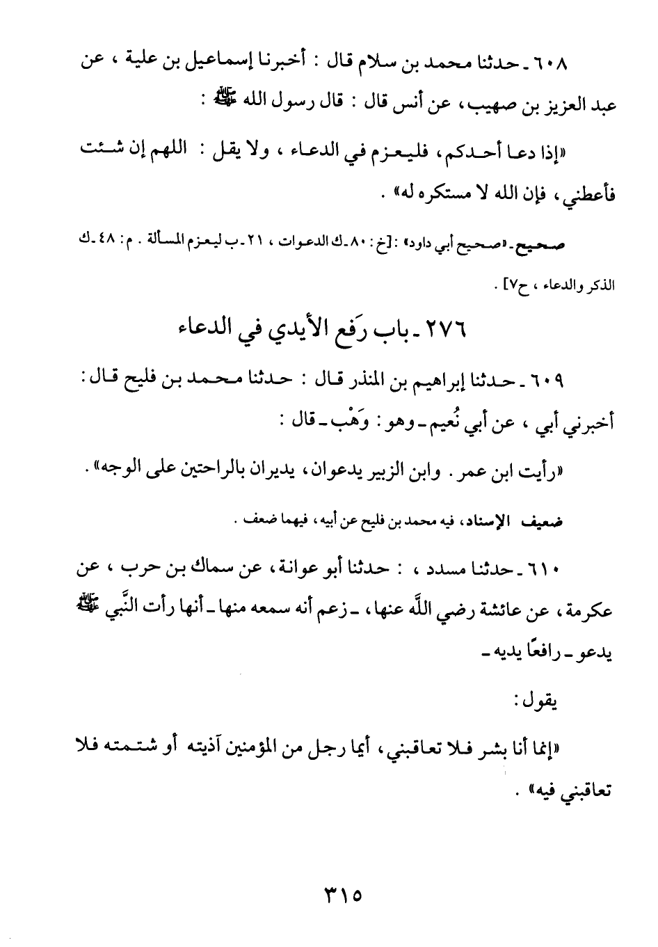 610 - عن عائشة رضي الله عنها أَنَّهَا رأتِ النبيَ صَلَّى اللهُ عَلَيْهِ وَسَلَّمَ يَدعو رافعاَ يَديهِ يَقول: (إِنَّما أَنا بَشرٌ فَلا تُعاقِبني، أَيما رَجلٌ مِن المُؤمنينَ آذيْتُه أَو شَتمتُهُ فَلا تُعاقِبني فِيه)