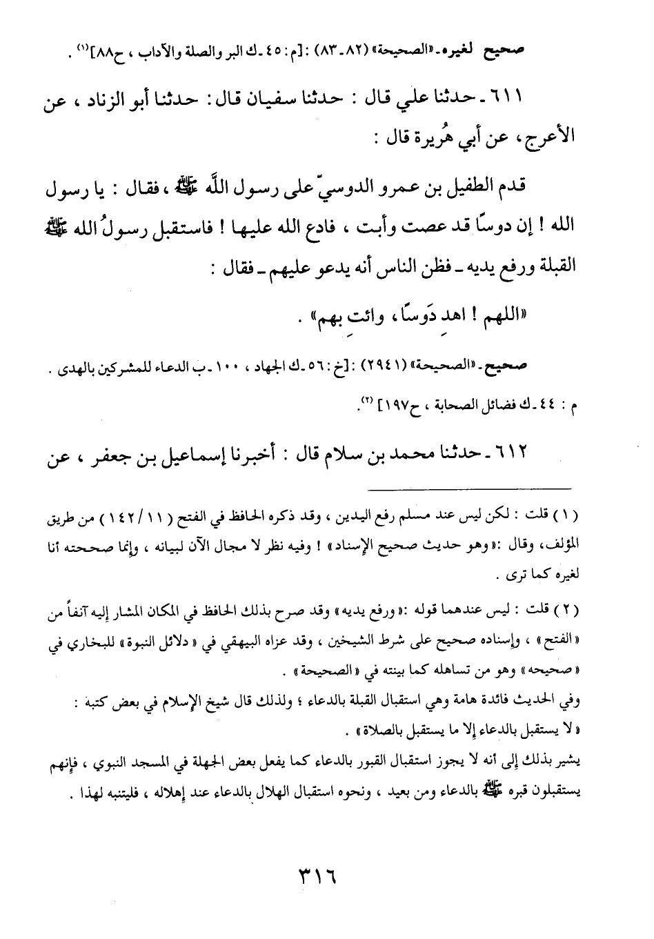 611 - عن أبي هريرة رضي الله عنه قَالَ: قَدِمَ الطُفيل بْنُ عَمْرٍو الدَّوْسِيُّ عَلى رَسُولِ اللَّهِ صَلَّى اللهُ عَلَيْهِ وَسَلَّمَ فَقَالَ: يَا رَسُولَ اللَّهِ إِنَّ دَوْسًا قَد عَصت وأَبت فَادعُ اللَّهَ عَليها فاستقبلَ رسولُ اللَّهِ صَلَّى اللهُ عَلَيْهِ وَسَلَّمَ القِبلةَ ورفَع يَديه فَظنَّ النَّاسُ أَنهُ يَدعُو عَليهم فَقال ك (اللهمَّ اهدِ دوساً وائتِ بِهم)