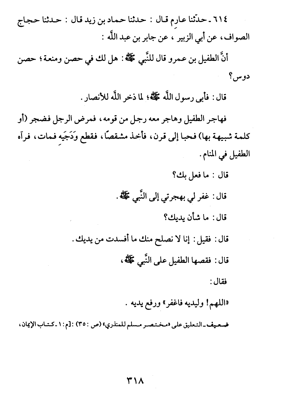614 - عن جابر بن عبد الله رضي الله عنهما أن الطفيل بن عمرو - رضي الله عنه - قَالَ لِلنَّبِيِّ صَلَّى اللهُ عَلَيْهِ وَسَلَّمَ: هَل لَك فِي حِصنٍ ومَنعة؟ حِصن دَوسٍ، قَالَ: فَأبى رَسُولُ اللَّهِ صَلَّى اللهُ عَلَيْهِ وَسَلَّمَ لِما ذَخِرَ اللَّهُ لِلْأَنْصَارِ فَهاجرَ الطفيلُ وهاجرَ مَعهُ رجلٌ مِنْ قَومه فَمرضَ الرَّجلُ فَضجِرَ أَو كلمةٌ شَبيهَةٌ بِها فَحبا إِلَى قَرنٍ فَأخذ مِشْقَصاً فَقطعَ ودَجَيْهِ فَمات، فَرآهُ الطُفيلُ فِي المَنام قَال: مَا فُعلَ بِكَ؟ قَالَ: غُفِر لِي بِهجرتي إِلَى النَّبِيِّ صَلَّى اللهُ عَلَيْهِ وَسَلَّمَ، قَالَ: مَا شَأنُ يَديك؟ قَالَ: فَقيل إِنا لَا نُصلحُ مِنكَ مَا أَفسدتَ مِن يَديكَ، قَالَ: فَقصها الطفيلُ عَلى النَّبِيِّ صَلَّى اللهُ عَلَيْهِ وَسَلَّمَ فَقال: (اللهُمَّ ولِيديهِ فَاغفر) ورَفعَ يَديه