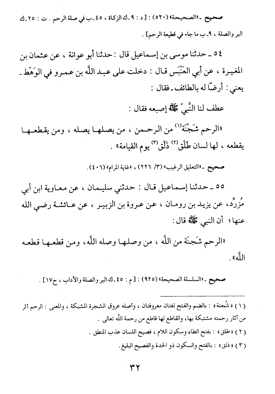 54 - عن عبد الله بن عمرو رضي الله عنهما قال: عَطَفَ لَنَا النَّبِيُّ صَلَّى اللهُ عَلَيْهِ وَسَلَّمَ إِصْبَعَهُ فَقَالَ: (الرَّحِمُ شَجْنَةُ مِنَ الرَّحْمَنِ مَنْ يَصِلْهَا يَصِلُه ومَنْ يَقْطَعْهَا يَقْطَعْهُ لَهَا لِسَانٌ طَلْق (¬1) ذَلْقٌ (¬2) يوم القيامة)