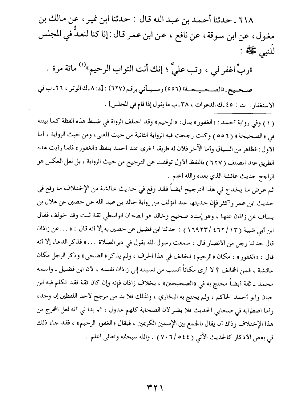 618 - عن ابن عمر رضي الله عنهما قَالَ: إنْ كُنا لَنعدُّ فِي المَجلس لِلنَّبِيِّ صَلَّى اللهُ عَلَيْهِ وَسَلَّمَ: (ربِّ اغفِر لِي وتُب عَلي إِنك أَنتَ التَّوابُ الرَّحيم) مَائة مَرةٍ.