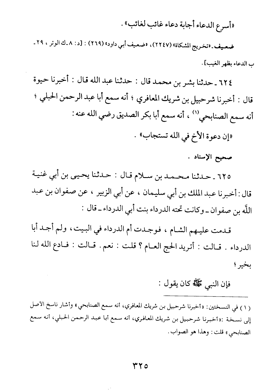 624 - (ث 154) عن الصُّنَابِحِيَّ أَنَّهُ سَمِعَ أَبَا بَكْرٍ الصِّدِّيقَ رَضِيَ الله عنه -يقول-: إنَّ دَعوةُ الأخِ فِي الله تُستَجابُ)