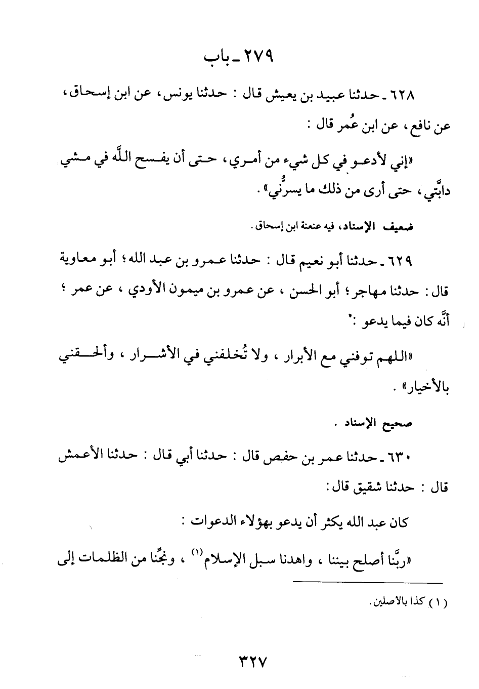630 - (ث 157) عن شَقِيقٌ قَالَ: كَان عَبد اللَّهِ يُكثر أنْ يَدعُو بِهؤلاءِ الدَّعواتِ ربنَّا أَصلح بَيننَا واهدِنَا سَبيلَ الإسلامِ ونَجِّنا مِن الظُلمَات إِلَى