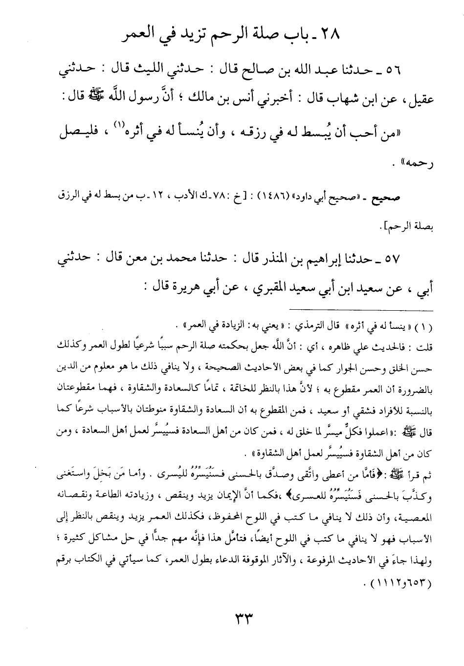 56 - عن أنس بن مالك - رَضِيَ اللَّهُ عَنْهُ - أَنَّ رَسُولَ اللَّهِ صَلَّى الله عليه وسلم قَالَ: (مَنْ أَحَبَّ أَنْ يُبْسَطَ لَهُ فِي رزقِهِ وَأَنْ يُنْسَأ لَهُ فِي أثَرِه فَلْيَصِلْ رَحِمَه)