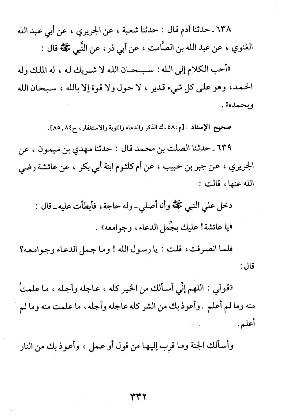 639 - عَنْ عَائِشَةَ رَضِيَ اللَّهُ عَنْهَا قَالَتْ: دَخل عَليَّ النبيُ صَلَّى اللهُ عَلَيْهِ وَسَلَّمَ وأَنا أُصلي ولَه حَاجة فَأبطأتُ عَليه قَالَ: (يَا عَائشة عَليكِ بِجُملِ الدُعاءِ وجَوامِعه) فَلما انصرَفتُ قُلت: يَا رَسُولَ اللَّهِ ومَا جُمَلِ الدُعاءِ وجَوامِعه؟ قَالَ: (قُولي: اللهُم إِنِّي أَسألُك مِن الخَير كُله عَاجِله وآجِله مَا عَلمتُ مِنه ومَا لَم أَعلم، وأَعوذُ بِك مِن الشَرِ كُلهِ عَاجِله وآجِله مَا عَلمتُ مِنه ومَا لَم أَعلم، وأَسألُك الجَنةَ ومَا قَربَ إِليها مِن قَولٍ أَو عَملٍ، وأَعوذُ بِك مِن النَّار