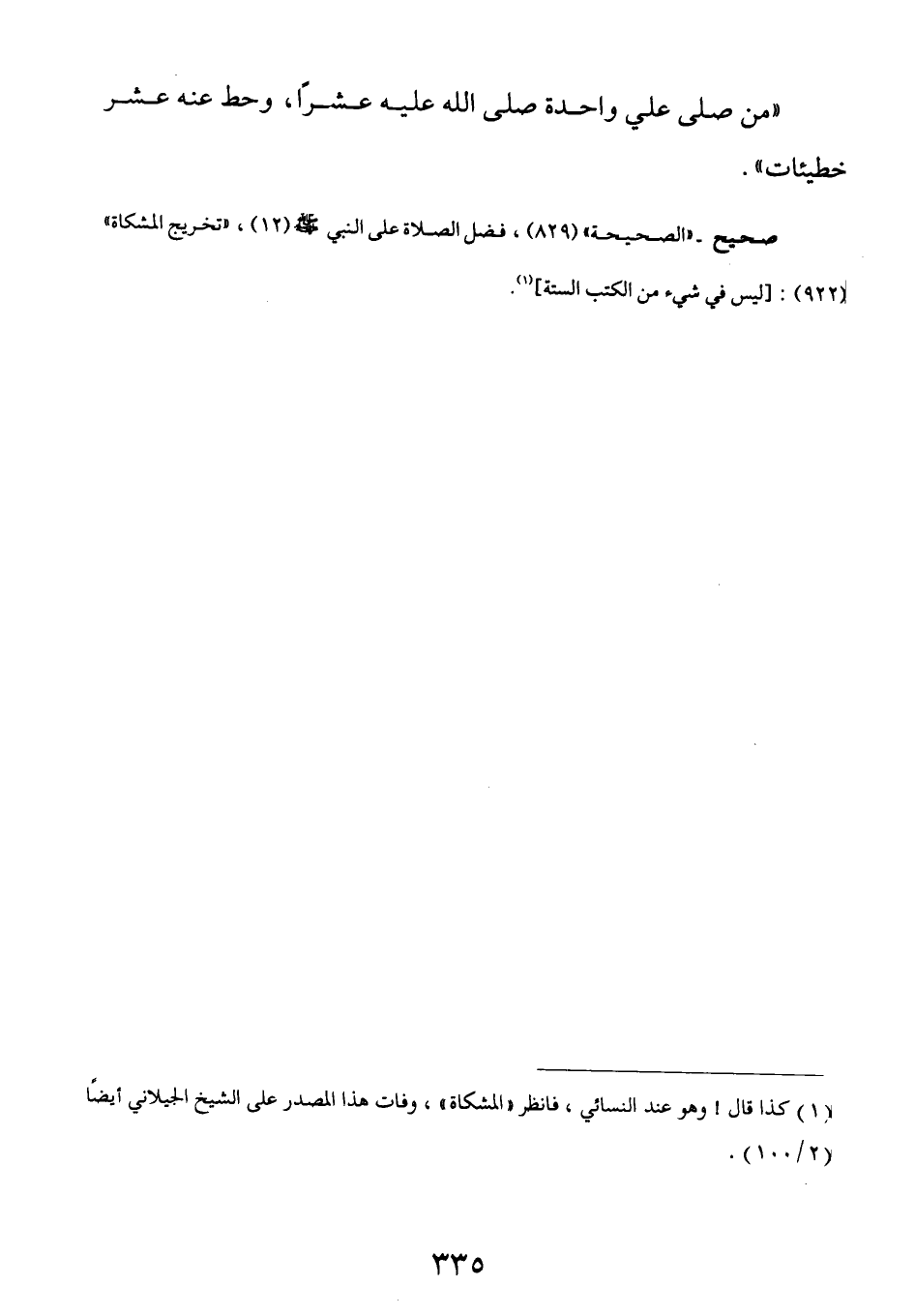 صحيح - «الصحيحة» (829) فضل الصَّلَاةِ عَلَى النَّبِيِّ صَلَّى اللهُ عَلَيْهِ وَسَلَّمَ (12) , (تخريج المشكاة) (922) : [ليس في شيء من الكتب السبة]