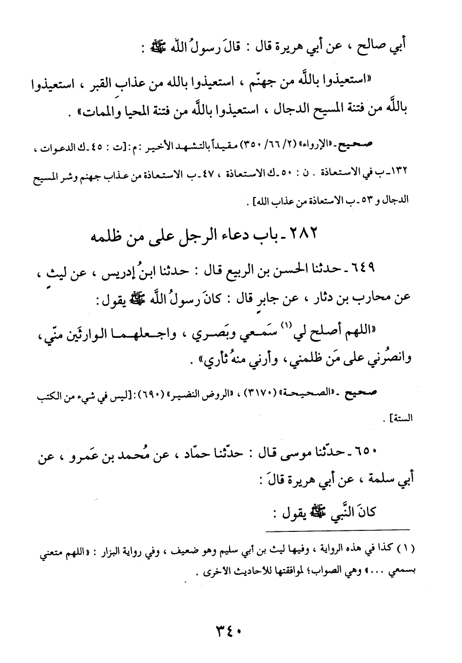 649 - عن جابر رضي الله عنه قَالَ: كَانَ رَسُولُ اللَّهِ صَلَّى اللهُ عَلَيْهِ وَسَلَّمَ يَقُولُ: (اللهُمَّ أَصلِح لِي سَمعِي وبَصرِي واجعَلهُما الوَارِثَيْنِ مِني، وانصُرنِي عَلى مَن ظَلمَنِي، وأَرنِي مِنه ثَأري)