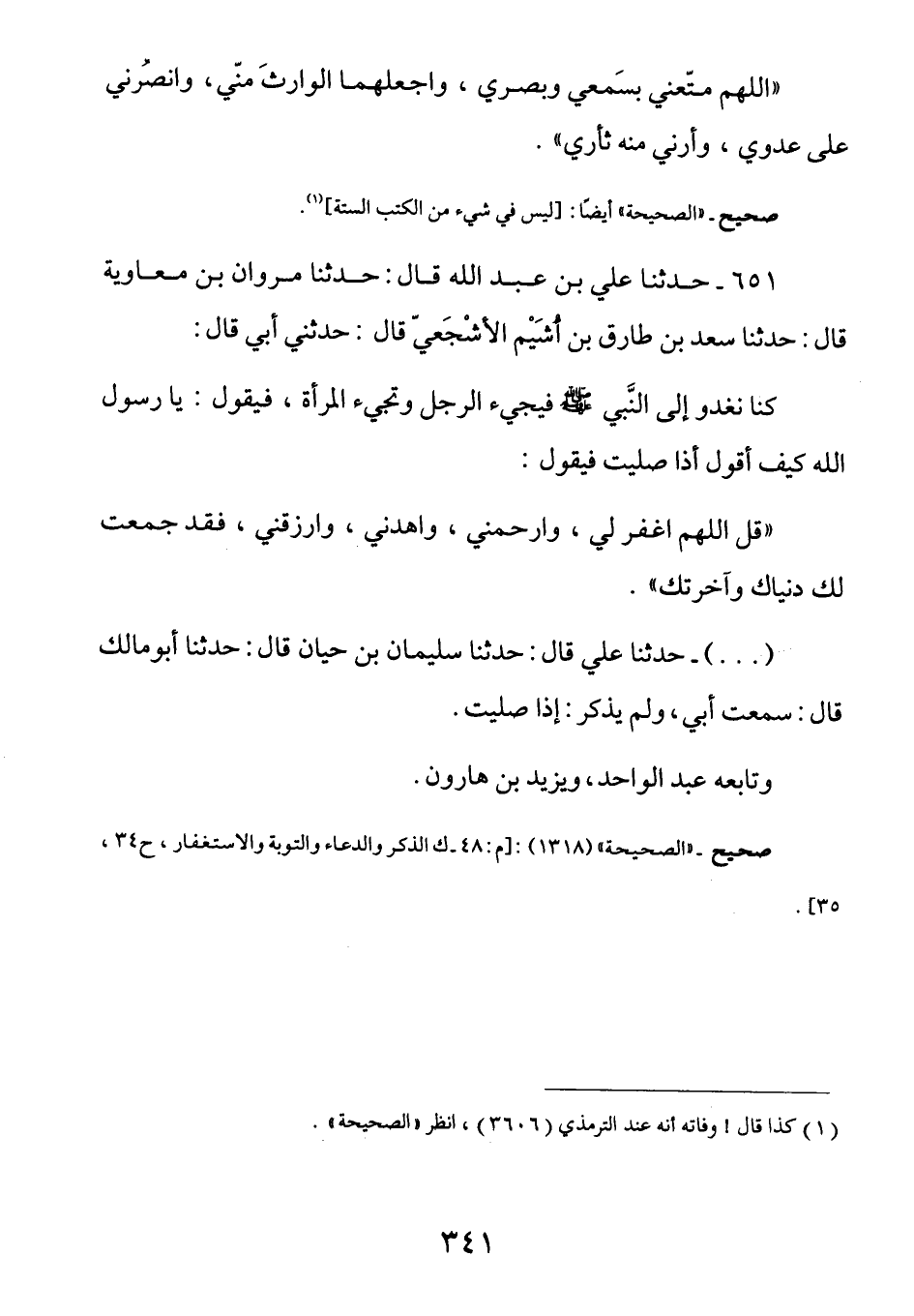 000 - حَدَّثَنَا عَلِيٌّ قَالَ حَدَّثَنَا سُلَيْمَانُ بْنُ حَيَّانَ قَالَ حَدَّثَنَا أَبُو مَالِكٍ قَالَ سَمِعْتُ أَبِي وَلَمْ يَذْكُرْ إِذَا صَلَّيْتَ وَتَابَعَهُ عَبْدُ الْوَاحِدِ ويزيد بن هارون.