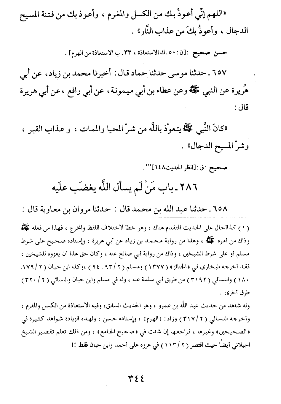 657 - عن أبي هريرة رَضِيَ اللَّهُ عَنْهُ قَالَ: كَانَ النَّبِيُّ صَلَّى اللهُ عَلَيْهِ وَسَلَّمَ يَتعوذُ بِالله مِن شَرِّ المَحيا والمَمَات، وعَذاب القَبر وشَر المَسيحِ الدجَّال)