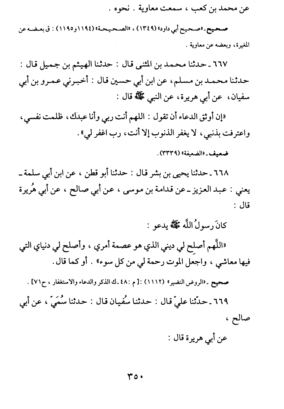 668 - عن أبي هريرة رضي الله عنه قَالَ: كَانَ رَسُولُ اللَّهِ صَلَّى اللهُ عَلَيْهِ وَسَلَّمَ يَدعُو: (اللهُمَّ أصلِح لِي دِينِي الذِّي هُو عِصمةُ أَمري وأَصلح لِي دُنيايَ التِي فِيها مَعاشِي واجعَل المَوتَ رَحْمَةً لِي مِن كُل سُوء) أو كما قال.