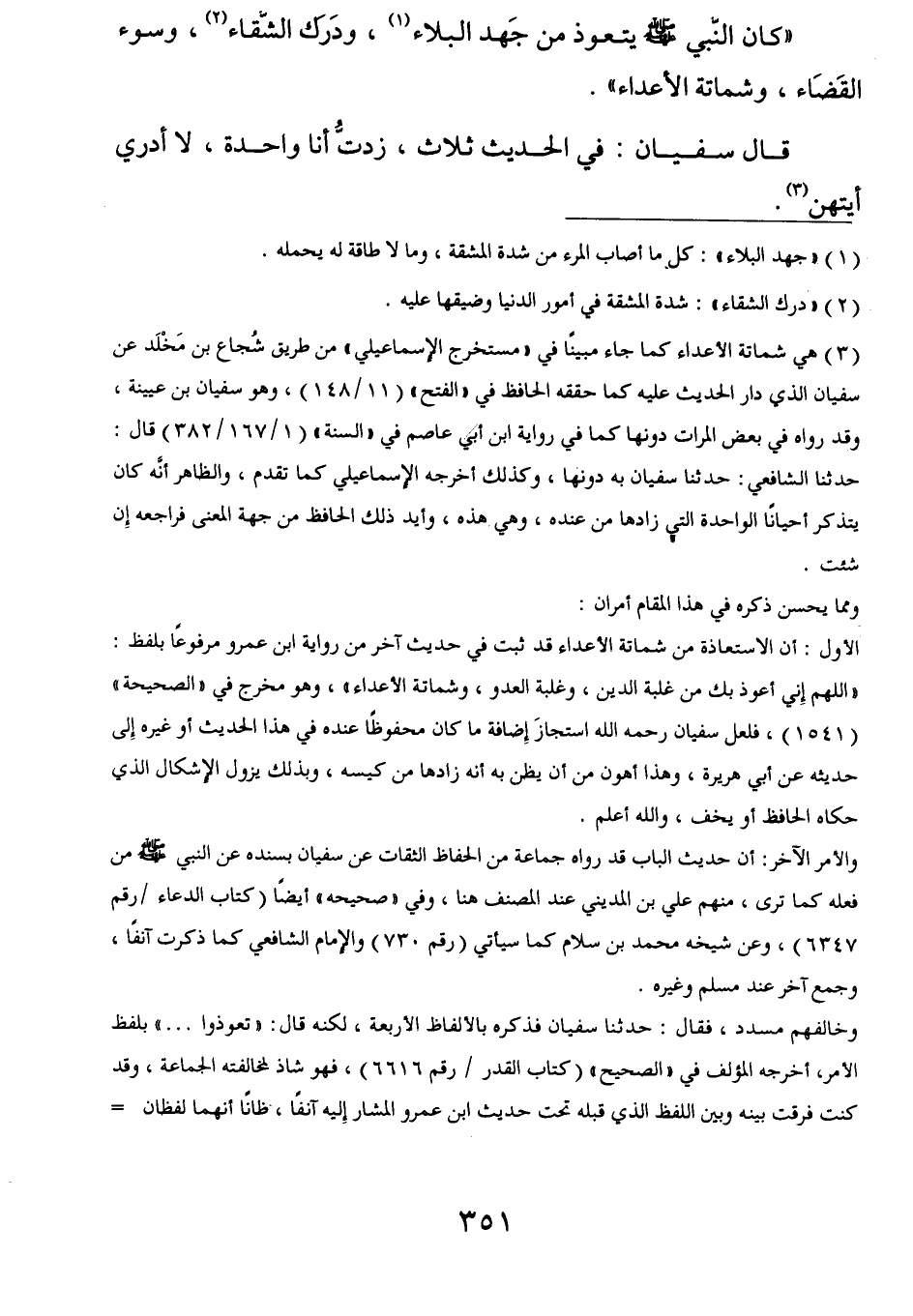 كَانَ النَّبِيُّ صَلَّى اللهُ عَلَيْهِ وَسَلَّمَ يَتعوذُ مِن جَهد البَلاء ودَركِ الشَقاء (¬1) وسُوءِ القَضاء وشَمَاتَة الأعدَاء. قَالَ سُفيان: فِي الْحَدِيثِ ثلاثٌ زدتُ أنَا واحِدةٌ لا أدري أيتهن.