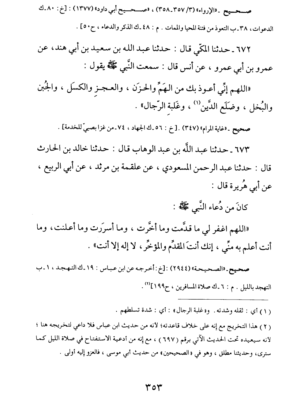 673 - عن أبي هريرة رضي الله عنه قَالَ: كَانَ مِن دُعاء النَّبِيِّ صَلَّى اللهُ عَلَيْهِ وَسَلَّمَ: (اللهُمَّ اغِفرِ لِي مَا قَدمتُ ومَا أَخرتُ ومَا أسرَرتُ، وَمَا أَعلنتُ، وَمَا أَنتَ أَعلمُ بِه مِني، إنكَ أنتَ المُقدِم والمُؤخِر لا إله إلا أنَت)