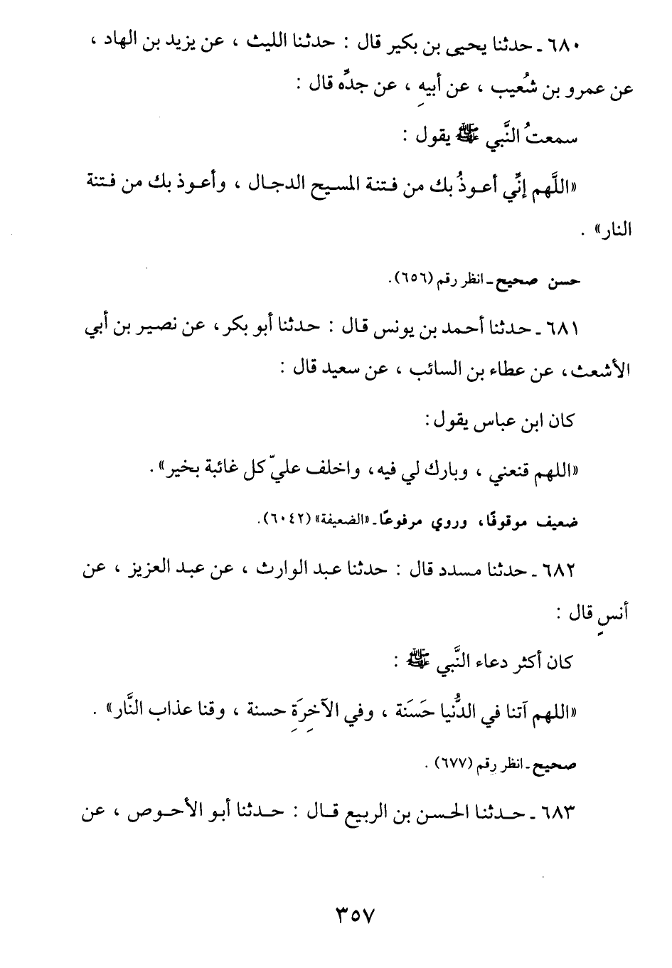 680 - عَنْ عَمْرِو بْنِ شُعَيْبٍ عَنْ أَبِيهِ عَنْ جَدِّهِ قَالَ: سَمعتُ النَّبي صَلَّى اللهُ عَلَيْهِ وَسَلَّمَ يَقول: (اللهُمَّ إنِي أَعوذُ بِك مِن فِتنةِ المَسيحِ الدَّجَال وأَعوذُ بِك مِن فِتنةِ النَّار)