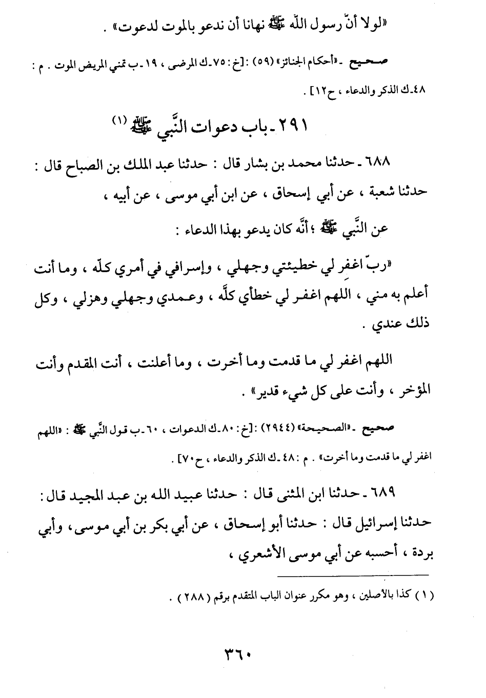 688 - عن ابن أبي موسى عن أبيه رَضِيَ اللَّهُ عَنْهُ عَنِ النَّبِيِّ صَلَّى اللهُ عَلَيْهِ وَسَلَّمَ أَنَّهُ كَانَ يَدْعُو بِهَذَا الدُّعَاءِ: (ربِّ اغفِر لِي خَطيئَتِي وجَهلِي وإسْرافِي فِي أَمري كُلَّهُ ومَا أنتَ أعلَم بِه مِني، اللهُمَّ اغفِر لِي خَطَأي كلَّهُ، وعَمدي وجَهلِي وهَزلِي وكُلُ ذَلِك عِندِي، اللهُمَّ اغفِر لِي مَا قَدمتُ ومَا أَخرتُ ومَا أسررتُ ومَا أَعلنتُ، أنتَ المُقدِّمُ وأنتَ المُؤخِر وأَنتَ عَلى كُل شَيءٍ قَدير) .