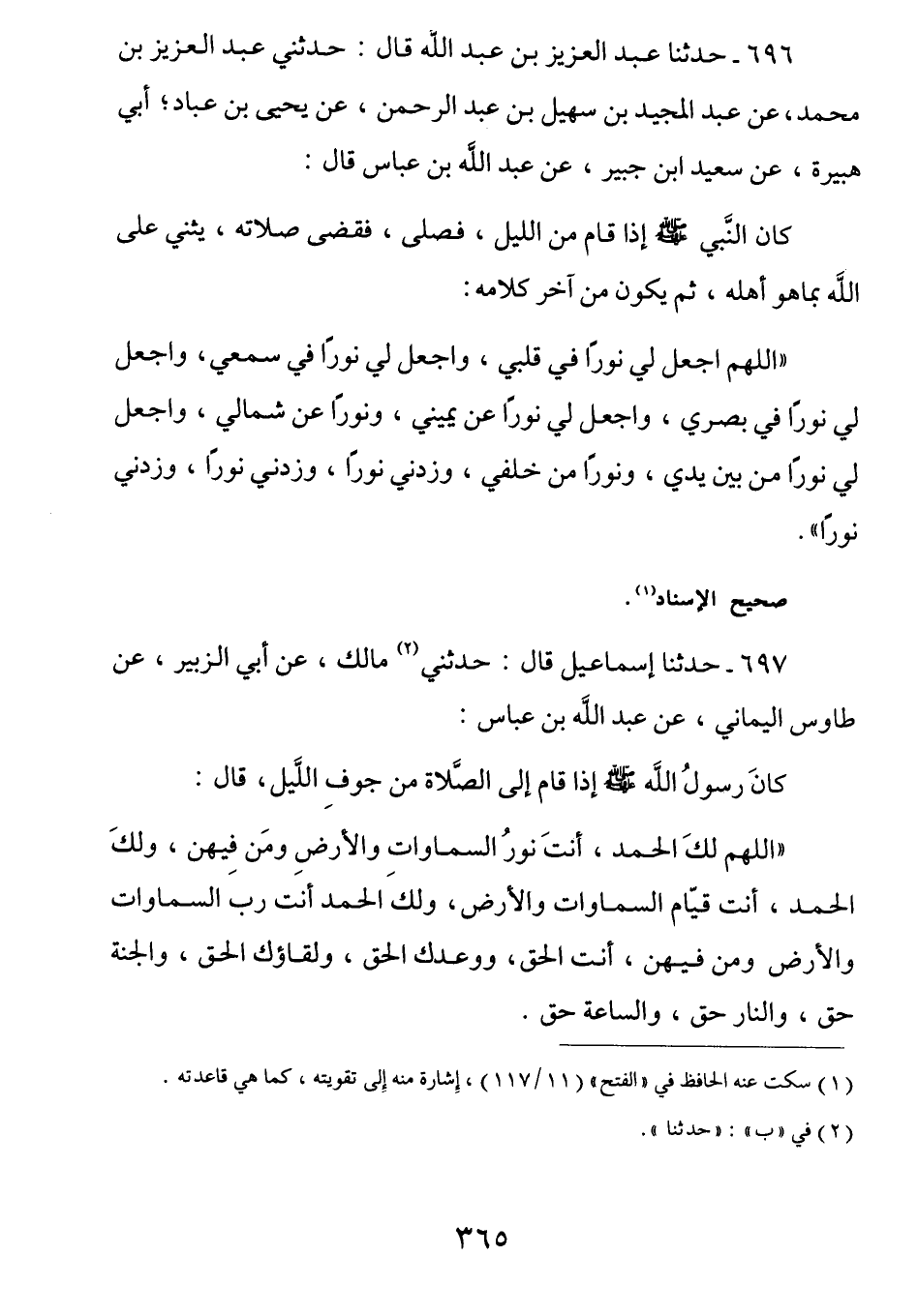 697 - عن ابن عباس رضي الله عنهما كَانَ رَسُولُ اللَّهِ صَلَّى اللهُ عَلَيْهِ وَسَلَّمَ إِذا قَام إِلَى الصَلاةِ مِن جَوفِ اللَّيْلِ قَال: (اللهُم لَك الحَمدُ أَنت نُور السَماواتِ والأرضِ ومَن فِيهنَّ ولَك الحَمدُ أَنتَ قيَّامُ السَماواتِ والأرضِ ولَك الحَمدُ أَنت رَبُ السَماواتِ والأرضِ ومَن فِيهِنَّ، أَنتَ الحَقُ ووعْدُك الحَقُ ولِقاؤُك الحَقُ، والجَنةُ حَقٌ والنَّارُ حَقٌ والسَاعة حَقٌ،