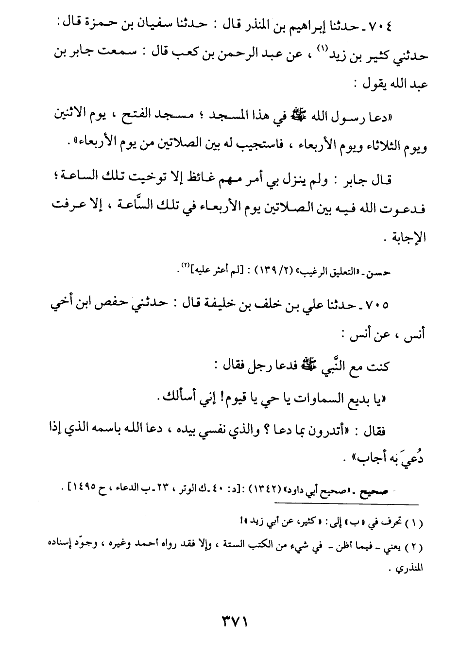 704 - عن جابر بن عبد الله رضي الله عنهما يقال: دَعَا رَسُولُ اللَّهِ صَلَّى اللهُ عَلَيْهِ وَسَلَّمَ فِي هَذَا الْمَسْجِدِ مَسْجِدِ الْفَتْحِ يَوْمَ الِاثْنَيْنِ وَيَوْمَ الثُّلَاثَاءِ وَيَوْمَ الْأَرْبِعَاءِ فَاسْتُجِيبَ لَهُ بَيْنَ الصَّلَاتَيْنِ مِنْ يَوْمِ الْأَرْبِعَاءِ، قَالَ جَابِرٌ: وَلَمْ يَنْزِلْ بِي أَمْرٌ مُهِمٌّ غائِظٌ إِلَّا تَوَخَّيْتُ تِلْكَ السَّاعَةَ فَدَعَوْتُ اللَّهَ فِيهِ بَيْنَ الصَّلَاتَيْنِ يَوْمَ الْأَرْبِعَاءِ فِي تِلْكَ السَّاعَةِ إِلَّا عَرَفْتُ الإجابة.