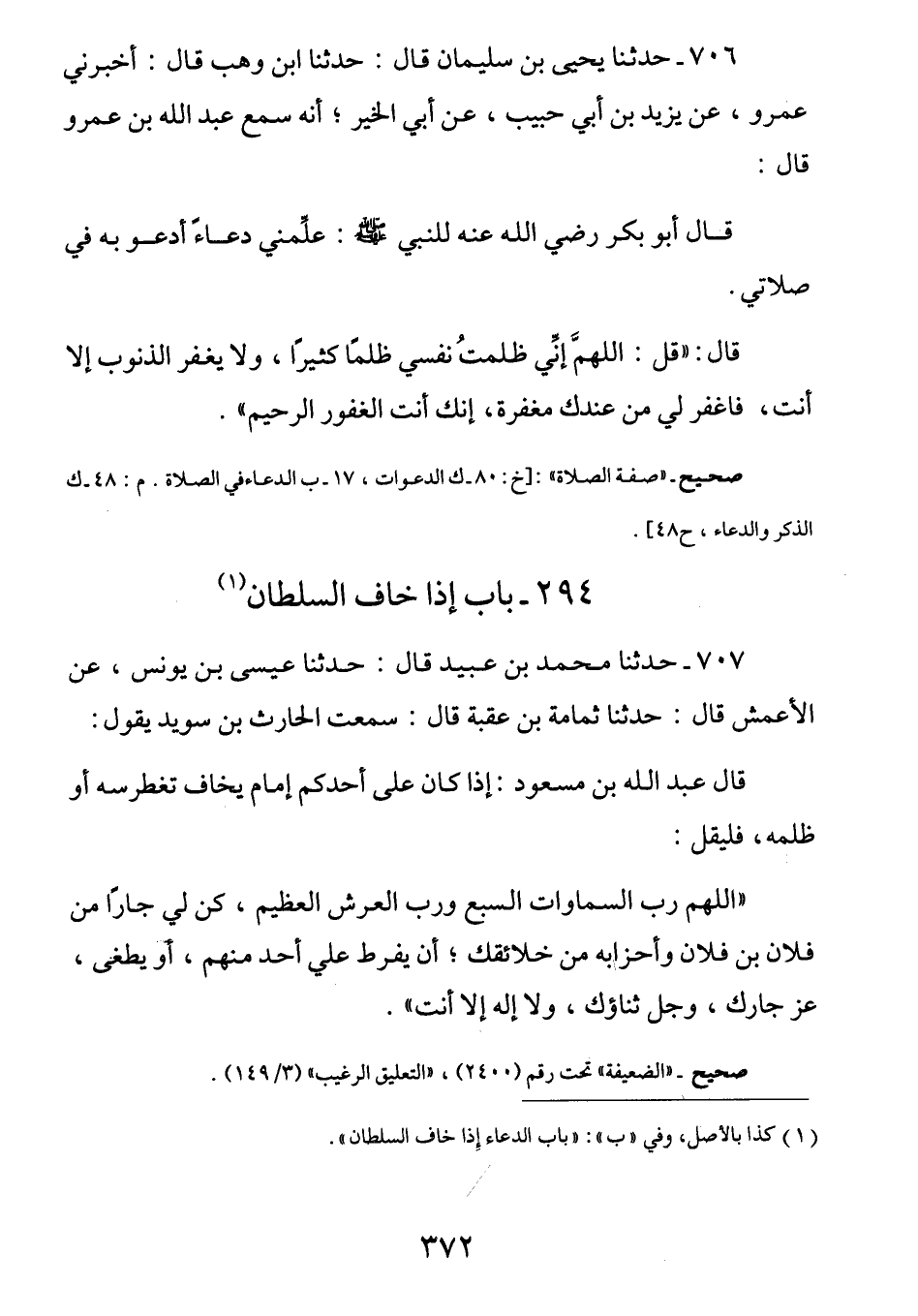 706 - عَنْ عَبْدِ اللَّهِ بْنِ عَمْرٍو قَالَ قَالَ أَبُو بَكْرٍ رَضِيَ اللَّهُ عَنْهُ لِلنَّبِيِّ صَلَّى اللهُ عَلَيْهِ وَسَلَّمَ عَلِّمْنِي دُعَاءً أَدْعُو بِهِ فِي صَلَاتِي قَالَ قُلِ اللَّهُمَّ إِنِّي ظَلَمْتُ نَفْسِي ظُلْمًا كَثِيرًا وَلَا يَغْفِرُ الذُّنُوبَ إِلَّا أَنْتَ فَاغْفِرْ لِي مِنْ عِنْدِكَ مَغْفِرَةً إِنَّكَ أنت الغفور الرحيم