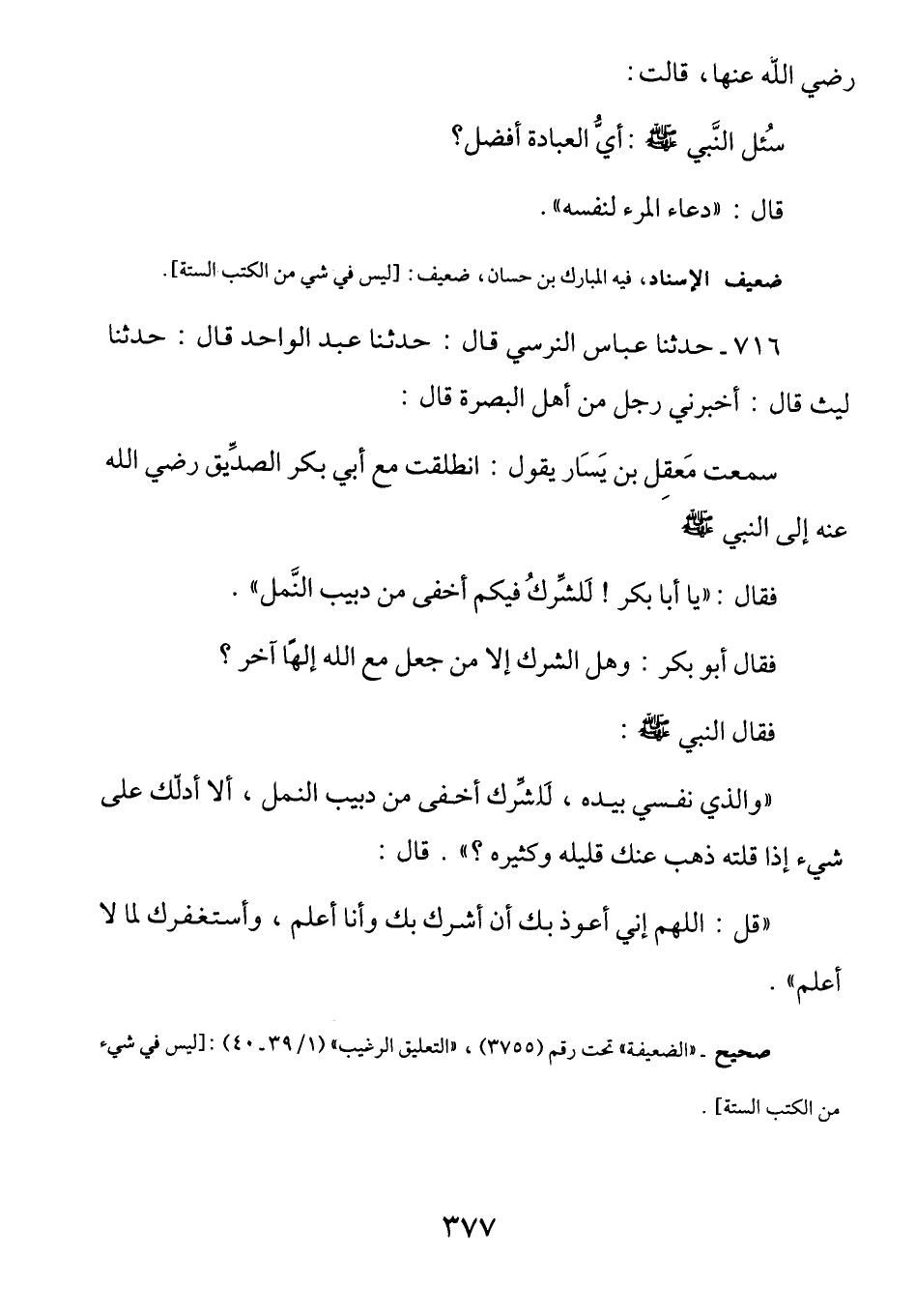 716 - عن معقل بن يسار قال انْطَلَقْتُ مَعَ أَبِي بَكْرٍ الصِّدِّيقِ رَضِيَ اللَّهُ عَنْهُ إِلَى النَّبِيِّ صَلَّى اللهُ عَلَيْهِ وَسَلَّمَ فَقَالَ: (يَا أَبَا بَكْرٍ لَلشِّرْكُ فِيكُمْ أَخْفَى مِنْ دَبِيبِ النَّمْلِ) فَقَالَ أَبُو بَكْرٍ: وَهَلِ الشِّرْكُ إِلَّا مَنْ جَعَلَ مَعَ اللَّهِ إِلَهًا آخر؟ قال النَّبِيُّ صَلَّى اللهُ عَلَيْهِ وَسَلَّمَ: (وَالَّذِي نَفْسِي بِيَدِهِ لَلشِّرْكُ أَخْفَى مِنْ دَبِيبِ النَّمْلِ، أَلَا أَدُلُّكَ عَلَى شَيْءٍ إِذَا قُلْتَهُ ذَهَبَ عَنْكَ قَلِيلُهُ وَكَثِيرُهُ؟ قَالَ: (قُلِ اللَّهُمَّ إِنِّي أَعُوذُ بِكَ أَنْ أُشْرِكَ بِكَ وَأَنَا أَعْلَمُ وَأَسْتَغْفِرُكَ لما لا أعلم)