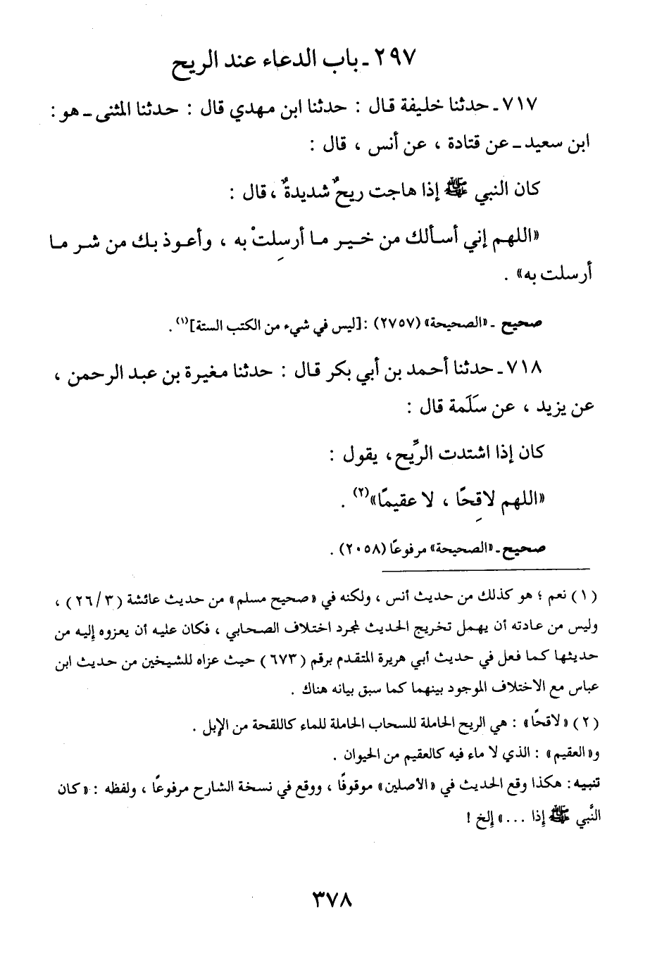 718 - عن سلمة رَضِيَ اللَّهُ عَنْهُ قَالَ: كَانَ النَّبِيُّ صَلَّى اللهُ عَلَيْهِ وَسَلَّمَ إِذَا اشْتَدَّتِ الرِّيحُ يَقُولُ: (اللَّهُمَّ لَاقِحًا، لَا عقيما)