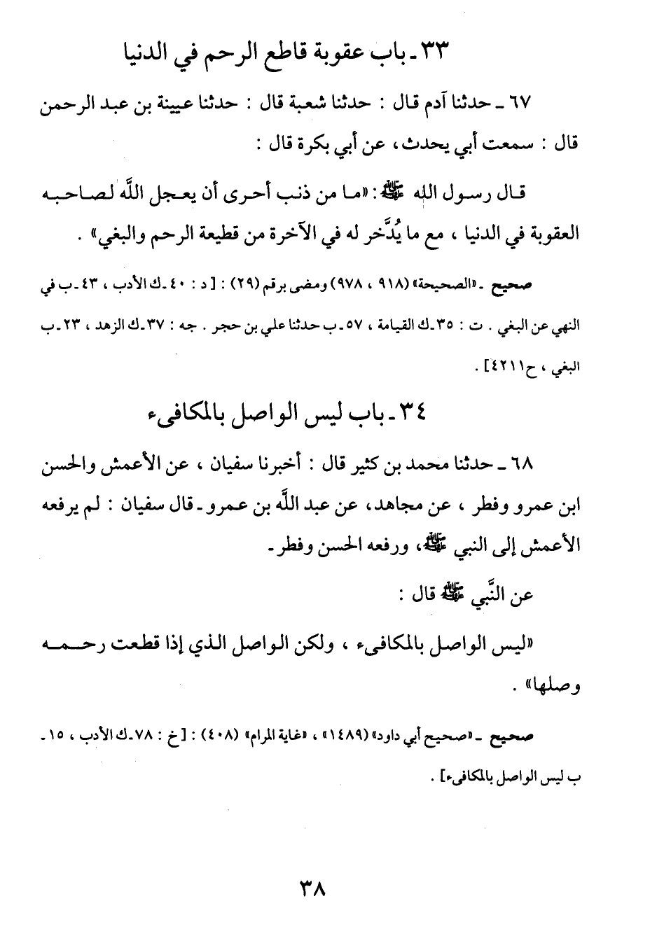 67 - عن أبى بكرة - رضي الله عنه - قَالَ: قَالَ رَسُولُ اللَّهِ صَلَّى اللهُ عَلَيْهِ وَسَلَّمَ: (مَا مِنْ ذَنْبٍ أحْرَى أَنْ يُعَجِلَ اللَّهُ لصاحِبِه الْعُقُوبَةَ فِي الدُّنْيَا مَعَ مَا يُدَّخرُ لَهُ فِي الْآخِرَةِ مِنْ قَطيعة الرَّحِمِ والبغي) .