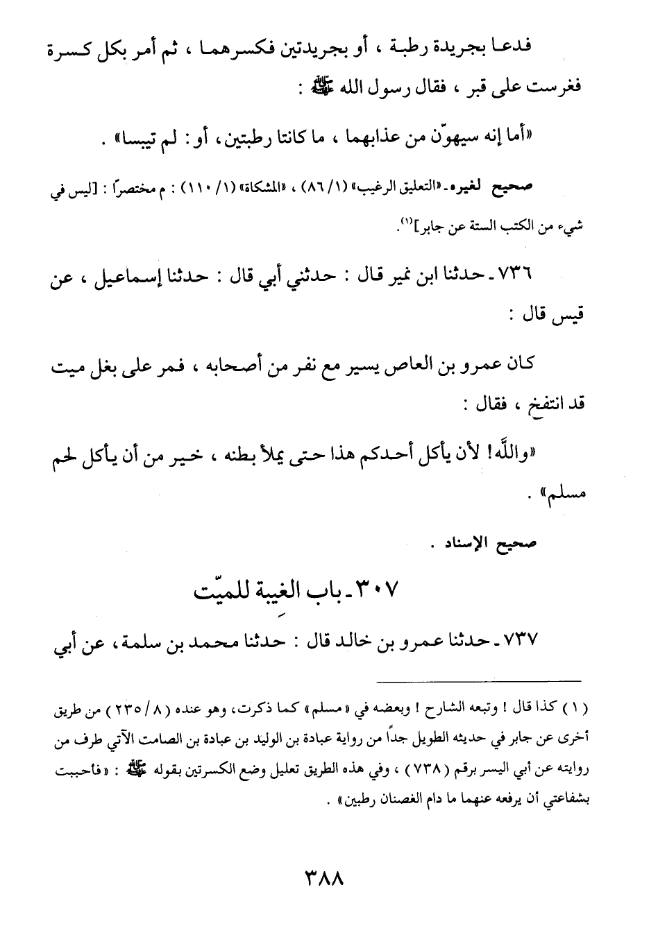 736 - (ث 171) عَنْ قَيْسٍ قَالَ كَانَ عَمْرُو بْنُ الْعَاصِ يَسِيرُ مَعَ نَفَرٍ مِنْ أَصْحَابِهِ فَمَرَّ عَلَى بَغْلٍ مَيِّتٍ قَدِ انْتَفَخَ فَقَالَ: وَاللَّهِ لَأَنْ يَأْكُلَ أَحَدُكُمْ هَذَا حَتَّى يَمْلَأَ بَطْنَهُ خَيْرٌ من أن يأكل لحم مسلم.