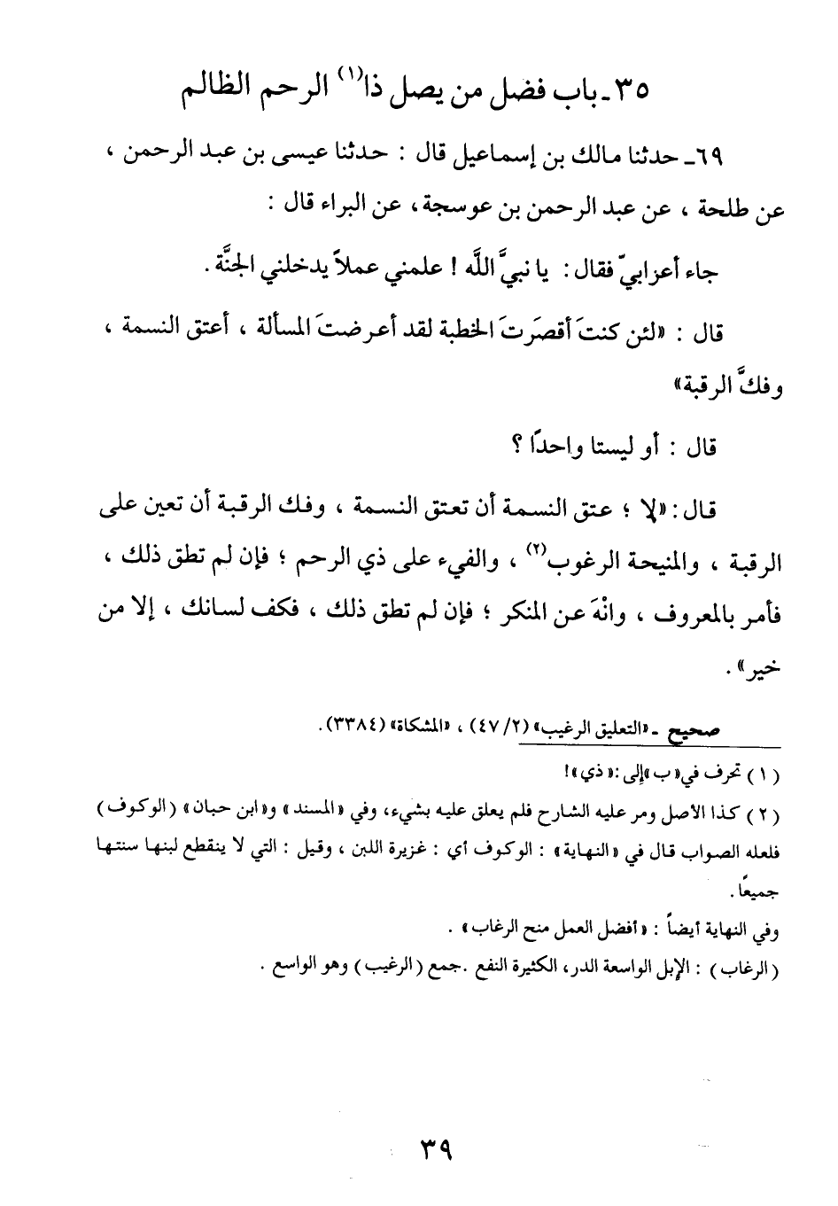 69 - عن البراء - رضي الله عنه - قَالَ: جَاءَ أَعْرَابِيٌّ فَقَالَ: يَا نَبِيَّ اللَّهِ عَلِّمْنِي عَمَلًا يُدْخِلُنِي الْجَنَّةَ قَالَ: (لَئِنْ كُنْتَ أَقَصَرْتَ الْخُطْبَةَ لَقَدْ أَعْرَضْتَ الْمَسْأَلَةَ أَعْتِقِ النَّسمة وفُكَّ الرَّقبة) قَالَ أَوَ لَيْسَتَا وَاحِدًا؟ قَالَ: (لَا عِتْقُ النَّسمة أَنْ تَعْتِقَ النَّسمة، وَفَكُّ الرَّقَبَةِ أَنْ تُعين عَلَى الرَّقبة والمنيحةُ الرَّغُوبُ (¬1) وَالْفَيْءُ عَلَى ذِي الرَّحم، فَإِنْ لَمْ تُطق ذَلِكَ فأمُر بِالْمَعْرُوفِ وَانْهَ عَنِ الْمُنْكَرِ، فَإِنْ لَمْ تُطِقْ ذَلِكَ فَكُف لِسَانَكَ إِلَّا مِنْ خير