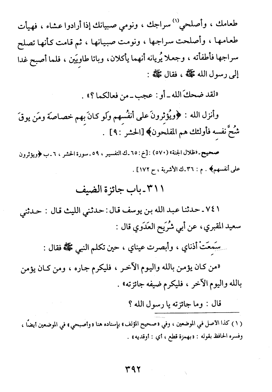 741 - عن شريح العدوي رضي الله عنه قَالَ: سَمِعَتْ أُذُنَايَ وَأَبْصَرَتْ عَيْنَايَ حِينَ تَكَلَّمَ النَّبِيُّ صَلَّى اللهُ عَلَيْهِ وَسَلَّمَ فَقَالَ: (مَنْ كَانَ يُؤْمِنُ بِاللَّهِ وَالْيَوْمِ الْآخِرِ فَلْيُكْرِمْ جَارِهِ، وَمَنْ كَانَ يُؤْمِنُ بِاللَّهِ وَالْيَوْمِ الْآخِرِ فَلْيُكْرِمْ ضَيْفَهُ جَائِزَتَهُ) قَالَ: وَمَا جَائِزَتُهُ يَا رَسُولَ الله؟