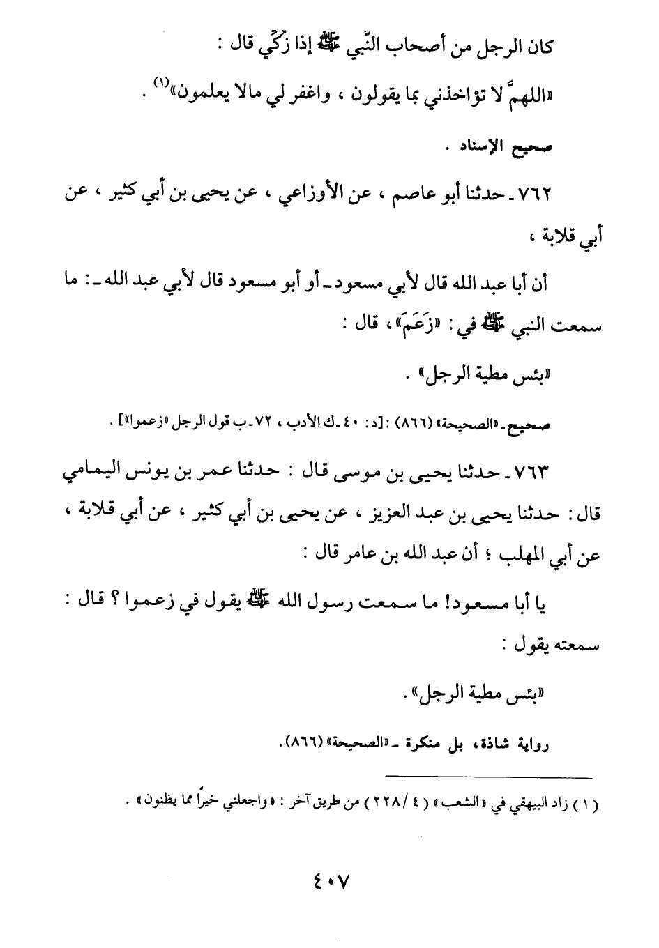 763 - عن أبي مسعود رضي الله عنه قَالَ: سَمِعْتُ رَسُولَ اللَّهِ صَلَّى اللهُ عَلَيْهِ وسلم يقول في زعموا: (بِئْسَ مَطِيَّةُ الرَّجُلِ)