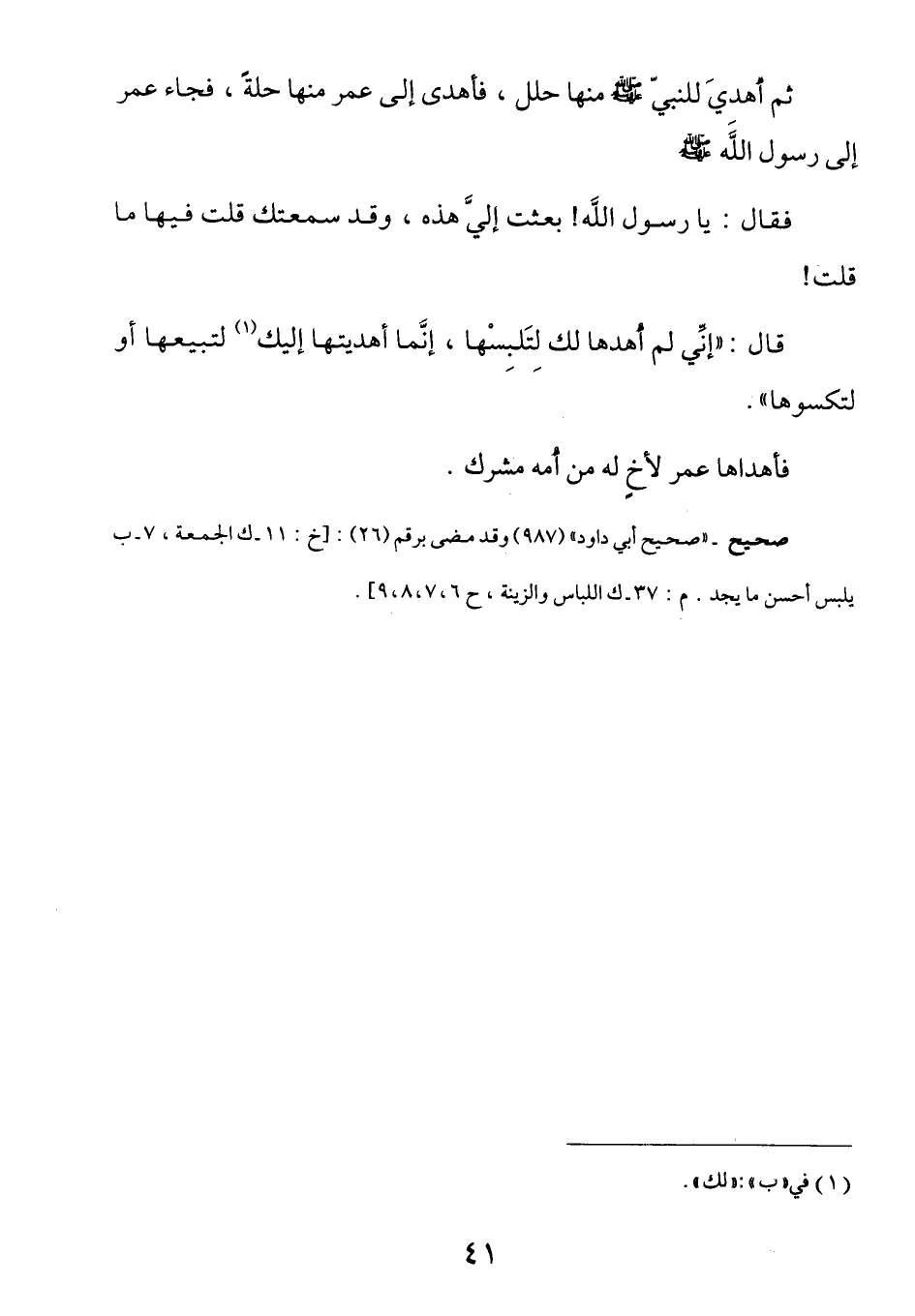 ثُمَّ أُهْدِى لِلنَّبِيِّ صَلَّى اللهُ عَلَيْهِ وَسَلَّمَ مِنْهَا حُلل فَأهْدَى إِلَى عُمَرَ مِنْهَا حُلة فَجَاءَ عُمَرُ إِلَى رَسُولِ اللَّهِ صَلَّى اللهُ عَلَيْهِ وَسَلَّمَ فَقَالَ يَا رَسُولَ اللَّهِ بَعَثْتَ إِلَيَّ هَذِهِ وَقَدْ سَمِعْتُكَ قُلْتَ فِيهَا مَا قُلْتَ. قَالَ: (إِنِّي لَمْ أُهْدِهَا لَكَ لِتَلْبَسها إِنَّمَا أهديْتُها إِلَيْكَ لِتَبِيعَهَا أَوْ لِتَكْسُوَهَا) فَأَهْدَاهَا عمر لأخ له من أُمِه مشرك.