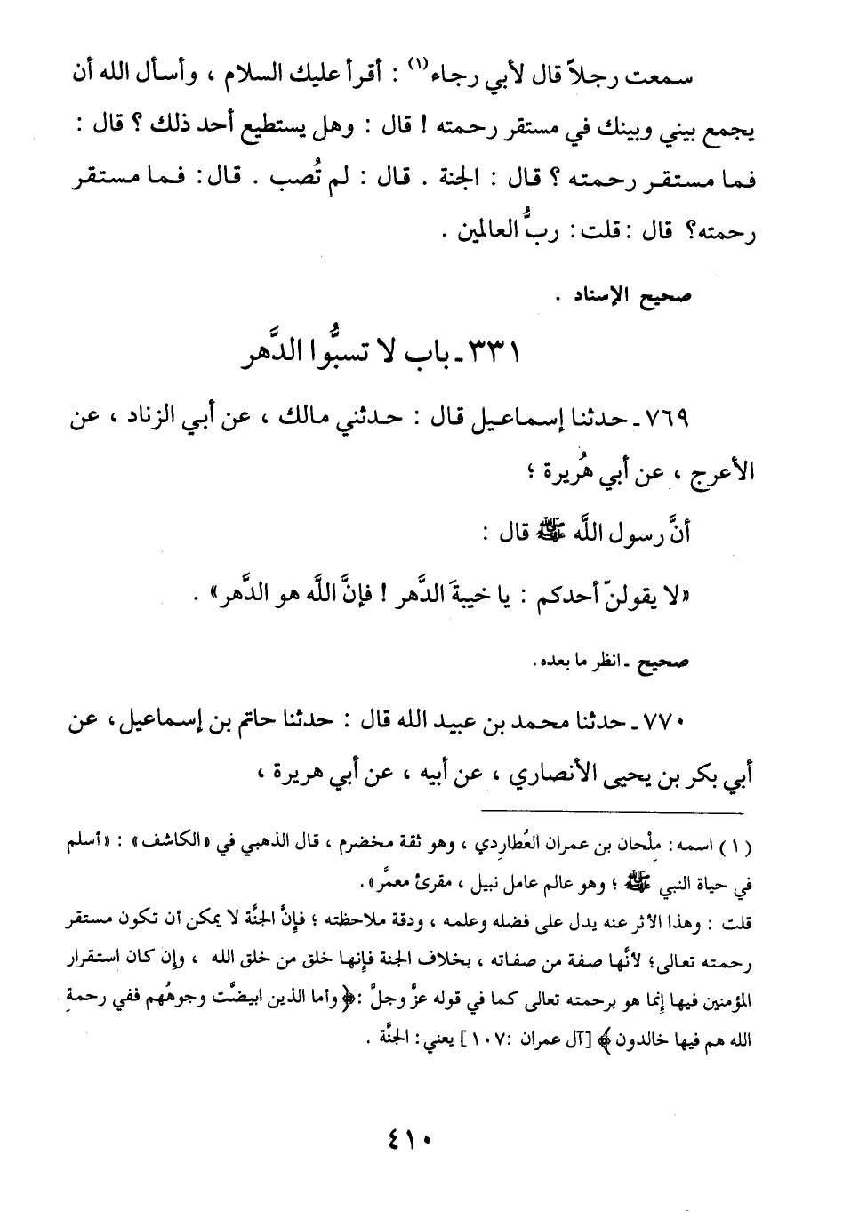 769 - عن أبي هريرة رَضِيَ اللَّهُ عَنْهُ أَنَّ النَّبِيَّ صَلَّى اللهُ عَلَيْهِ وَسَلَّمَ قَالَ: (لَا يَقُولَنَّ أَحَدُكُمْ يَا خيبة الدهر، فإن الله هو الدهر)