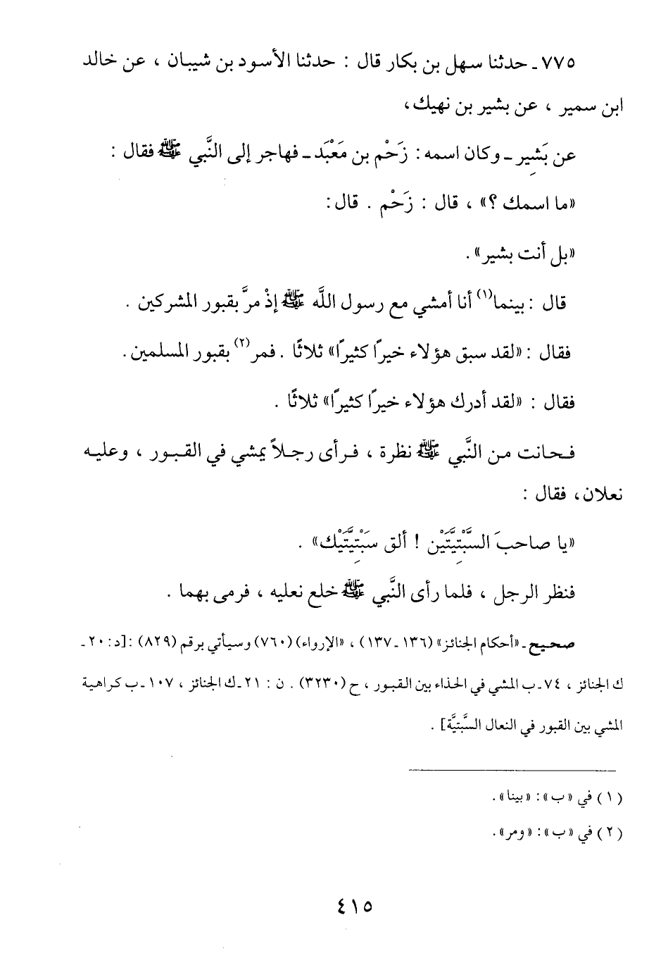 775 - عن بشير بن معبد السدوسي رضي الله عنه - وَكَانَ اسْمُهُ زَحْمَ بْنَ مَعْبَدٍ - فَهَاجَرَ إِلَى النَّبِيِّ صَلَّى اللهُ عَلَيْهِ وَسَلَّمَ فَقَالَ: (ما اسْمُكَ؟) قَالَ: زَحْمٌ، قَالَ: (بَلْ أَنْتَ بَشِيرٌ) قَالَ بَيْنَمَا أَنَا أَمْشِي مَعَ رَسُولِ اللَّهِ صَلَّى اللهُ عَلَيْهِ وَسَلَّمَ إِذْ مَرَّ بِقُبُورِ الْمُشْرِكِينَ فَقَالَ: (لَقَدْ سَبَقَ هَؤُلَاءِ خَيْرٌ كَثِيرٌ) ثَلَاثًا فَمَرَّ بِقُبُورِ الْمُسْلِمِينَ فَقَالَ: (لَقَدْ أَدْرَكَ هَؤُلَاءِ خَيْرًا كَثِيرًا) ثَلَاثًا فَحَانَتْ مِنَ النَّبِيِّ صَلَّى اللهُ عَلَيْهِ وَسَلَّمَ نَظْرَةٌ فَرَأَى رَجُلًا يَمْشِي فِي الْقُبُورِ وَعَلَيْهِ نَعْلَانِ فَقَالَ: (يَا صَاحِبَ السِّبْتِيَّتَيْنِ أَلْقِ سِبْتِيَّتَيْكَ) فَنَظَرَ الرَّجُلُ فَلَمَّا رَأَى النَّبِيَّ صَلَّى اللهُ عَلَيْهِ وَسَلَّمَ خَلَعَ نعليه فرمى بهما.