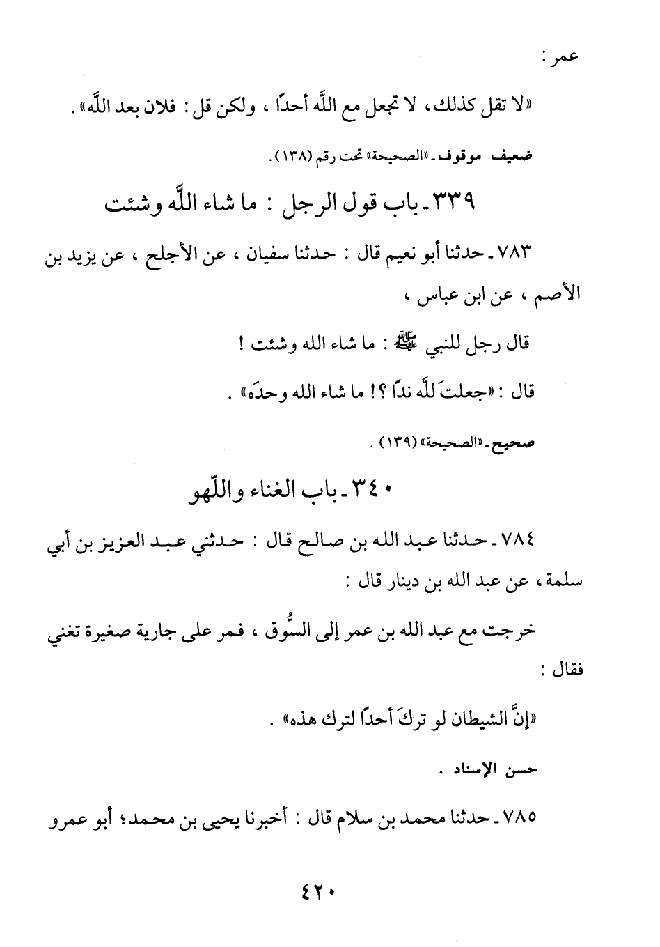 783 - عن ابن عباس رضي الله عنهما قَالَ: رَجُلٌ لِلنَّبِيِّ صَلَّى اللهُ عَلَيْهِ وَسَلَّمَ: مَا شَاءَ اللَّهُ وَشِئْتَ قَالَ: (جَعَلْتَ لِلَّهِ ندا ما شاء الله وحده)