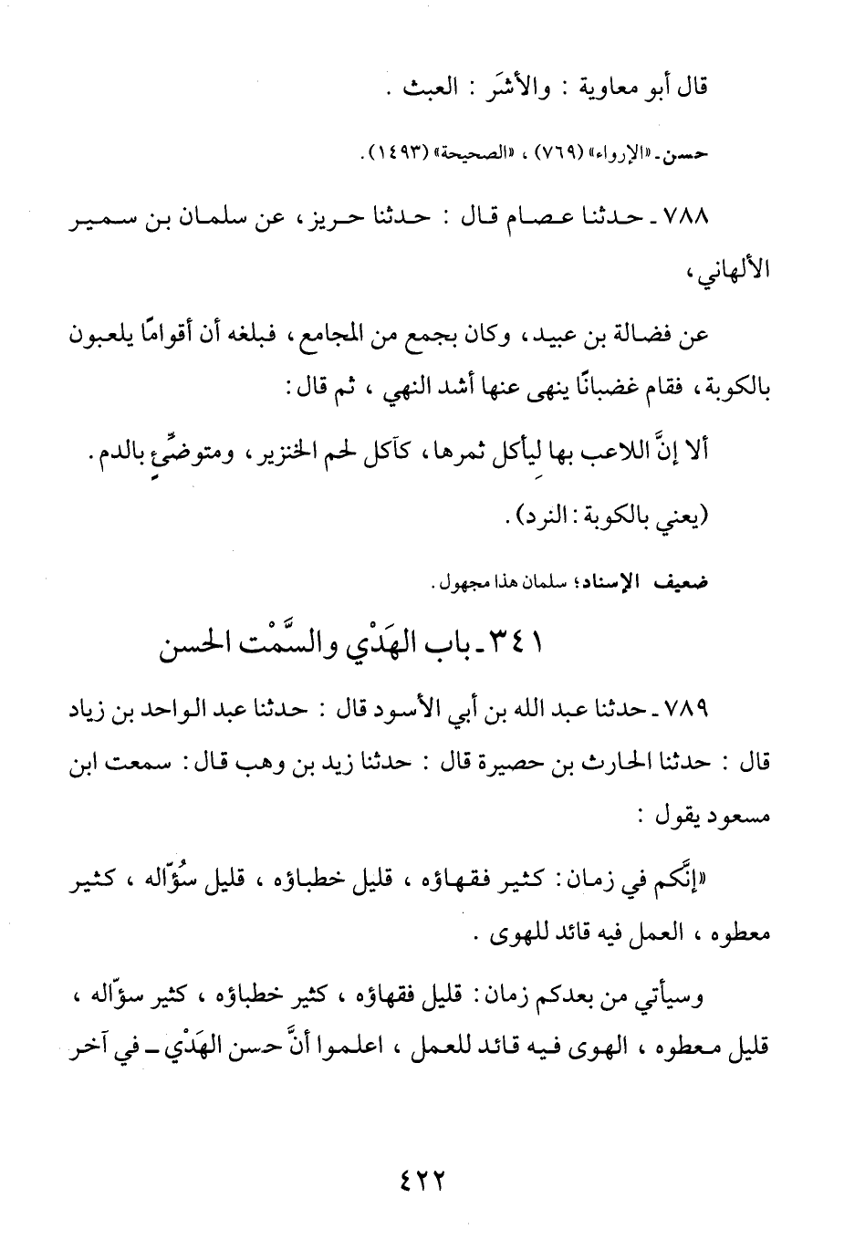 789 - (ث 178) عن ابن مسعود رضي الله عنه قال: إِنَّكُمْ فِي زَمَانٍ كَثِيرٌ فُقَهَاؤُهُ قَلِيلٌ خُطَبَاؤُهُ قَلِيلٌ سُؤَّالُهُ كَثِيرٌ مُعْطُوهُ، الْعَمَلُ فِيهِ قَائِدٌ لِلْهَوَى، وَسَيَأْتِي مِنْ بَعْدِكُمْ زَمَانٌ قَلِيلٌ فُقَهَاؤُهُ كَثِيرٌ خُطَبَاؤُهُ كَثِيرٌ سُؤَّالُهُ قَلِيلٌ مُعْطُوهُ، الْهَوَى فِيهِ قَائِدٌ لِلْعَمَلِ، اعْلَمُوا أَنَّ حُسْنَ الْهَدْيِ في آخر