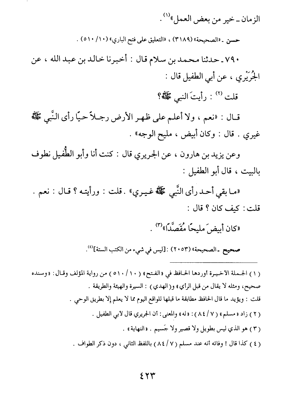 وَعَنْ يَزِيدَ بْنِ هَارُونَ عَنِ الْجُرَيْرِيِّ قَالَ: كُنْتُ أنا وأبو الطفيل عامر بن واثلة الكناني نَطُوفُ بِالْبَيْتِ قَالَ أَبُو الطُّفَيْلِ: مَا بَقِيَ أَحَدٌ رَأَى النَّبِيَّ صَلَّى اللهُ عَلَيْهِ وَسَلَّمَ غَيْرِي، قُلْتُ: وَرَأَيْتَهُ؟ قَالَ: نَعَمْ. قُلْتُ: كَيْفَ كان؟ قال: كان أبيض مليحا مقصدا.