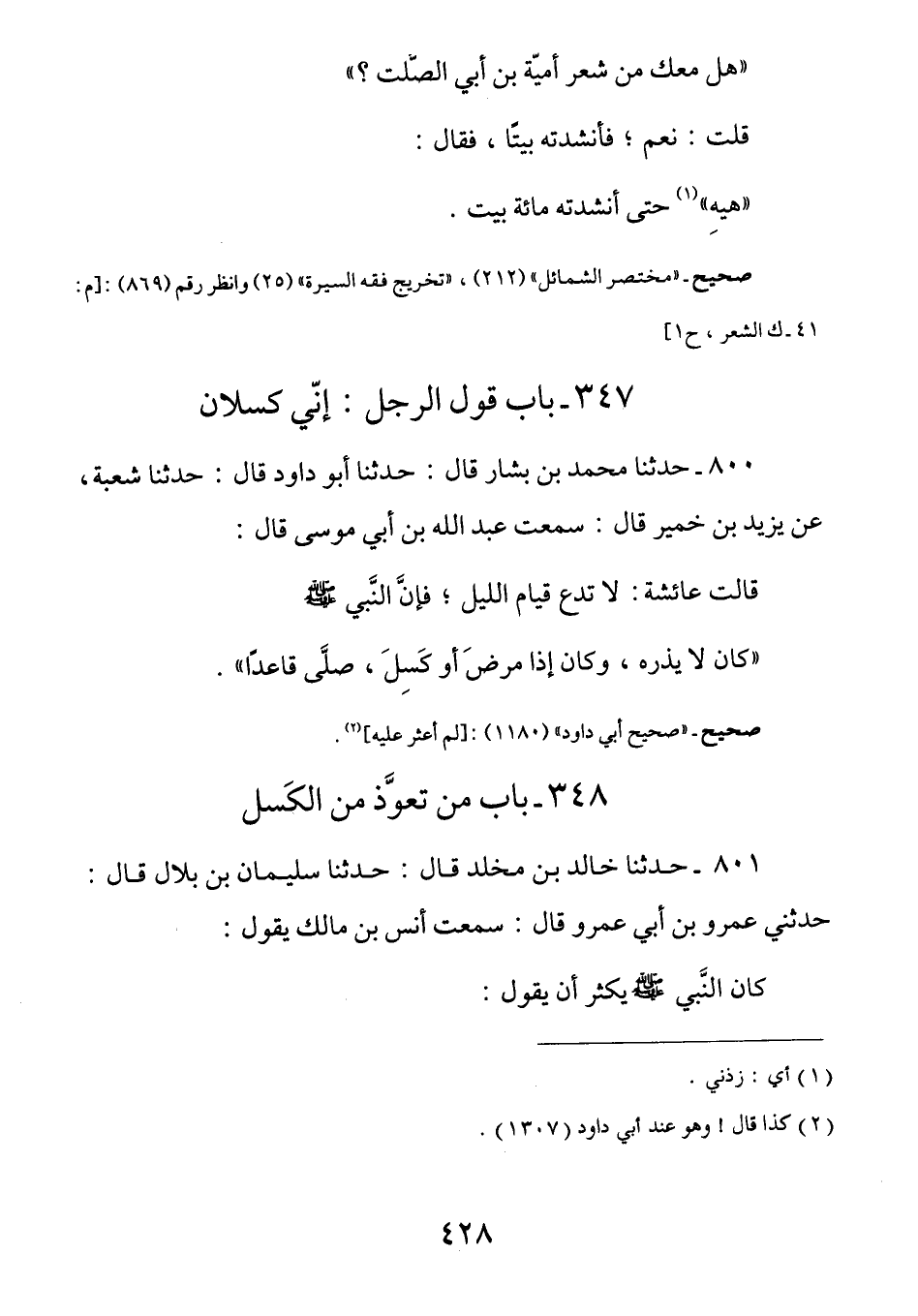 800 - عن عَبْدَ اللَّهِ بْنَ أَبِي مُوسَى قَالَ: قَالَتْ: عَائِشَةُ لَا تَدَعْ قِيَامَ اللَّيْلِ. فَإِنَّ النَّبِيَّ صَلَّى اللهُ عَلَيْهِ وَسَلَّمَ كَانَ لَا يَذَرُهُ. وَكَانَ إِذَا مَرِضَ أَوْ كَسِلَ صَلَّى قَاعِدًا.