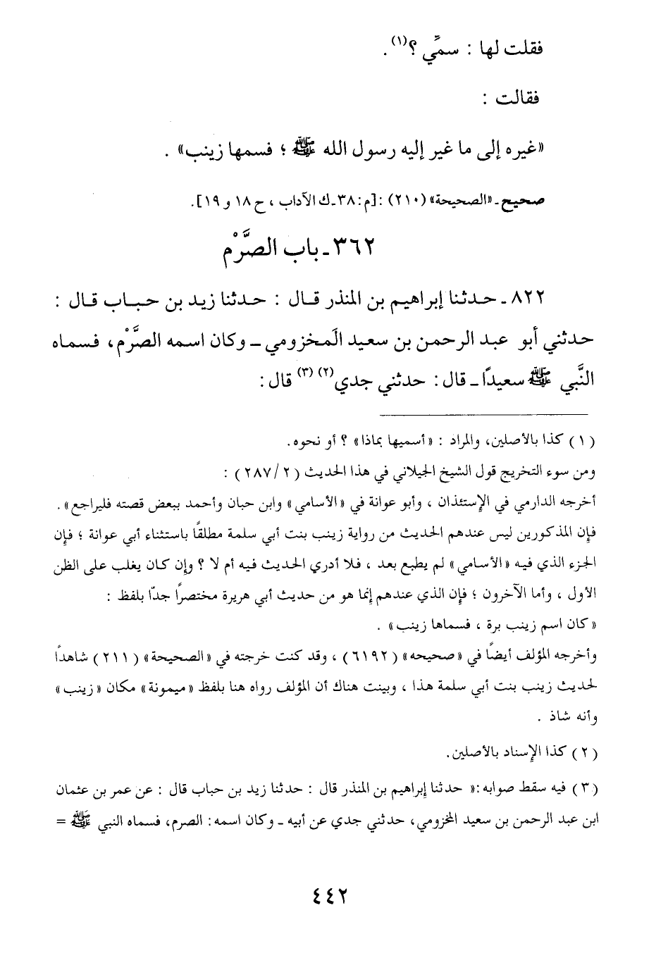 822 - عن عبد الرحمن بن سعيد الخزومي رضي الله عنه - وَكَانَ اسْمُهُ الصَّرْمَ - فَسَمَّاهُ النَّبِيُّ صَلَّى اللهُ عليه وسلم سعيدا قال: حدثني جدي قال: