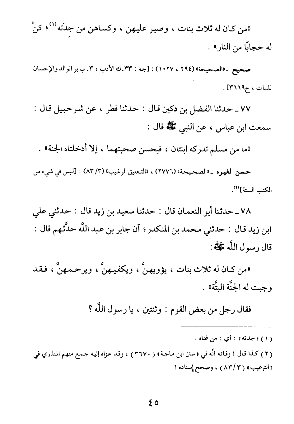 77 - عن ابن عباس رضي الله عنهما عَنِ النَّبِيِّ صَلَّى اللهُ عَلَيْهِ وَسَلَّمَ قَالَ: (مَا مِن مُسلم تُدركه ابْنَتَانِ فَيُحْسِنُ صحبتَهُما إلا أدخلتاه الجنة) .