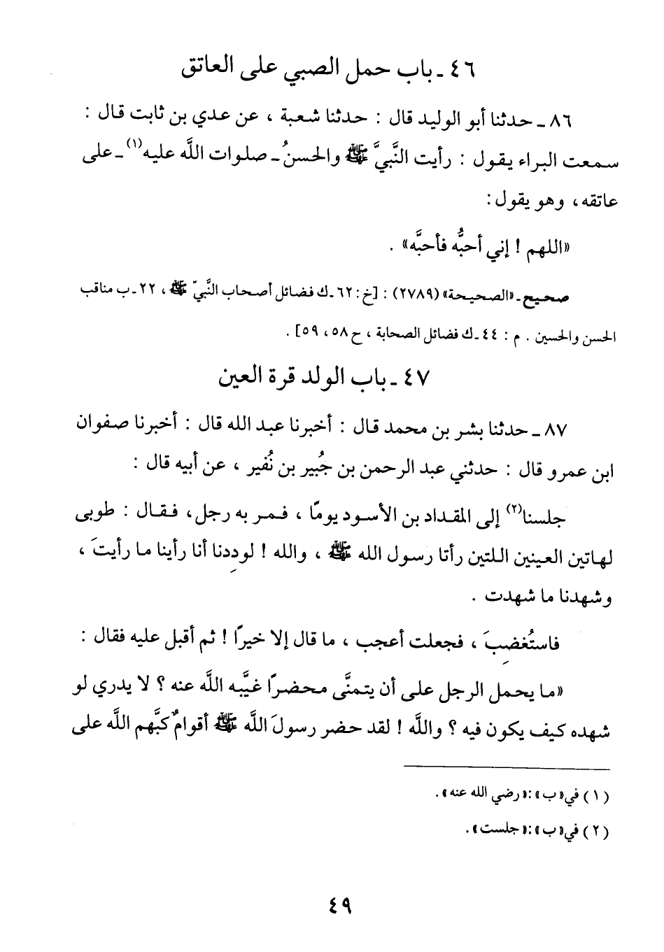 86 - عن البراء - رضي الله عنه - قَالَ: رَأَيْتُ النَّبِيَّ صَلَّى اللهُ عَلَيْهِ وَسَلَّمَ وَالْحَسَنُ - صَلَوَاتُ اللَّهِ عَلَيْهِ - عَلَى عَاتِقِهِ وَهُوَ يَقُولُ: (اللهم إني أُحِبُه فَأَحِبَّه) .