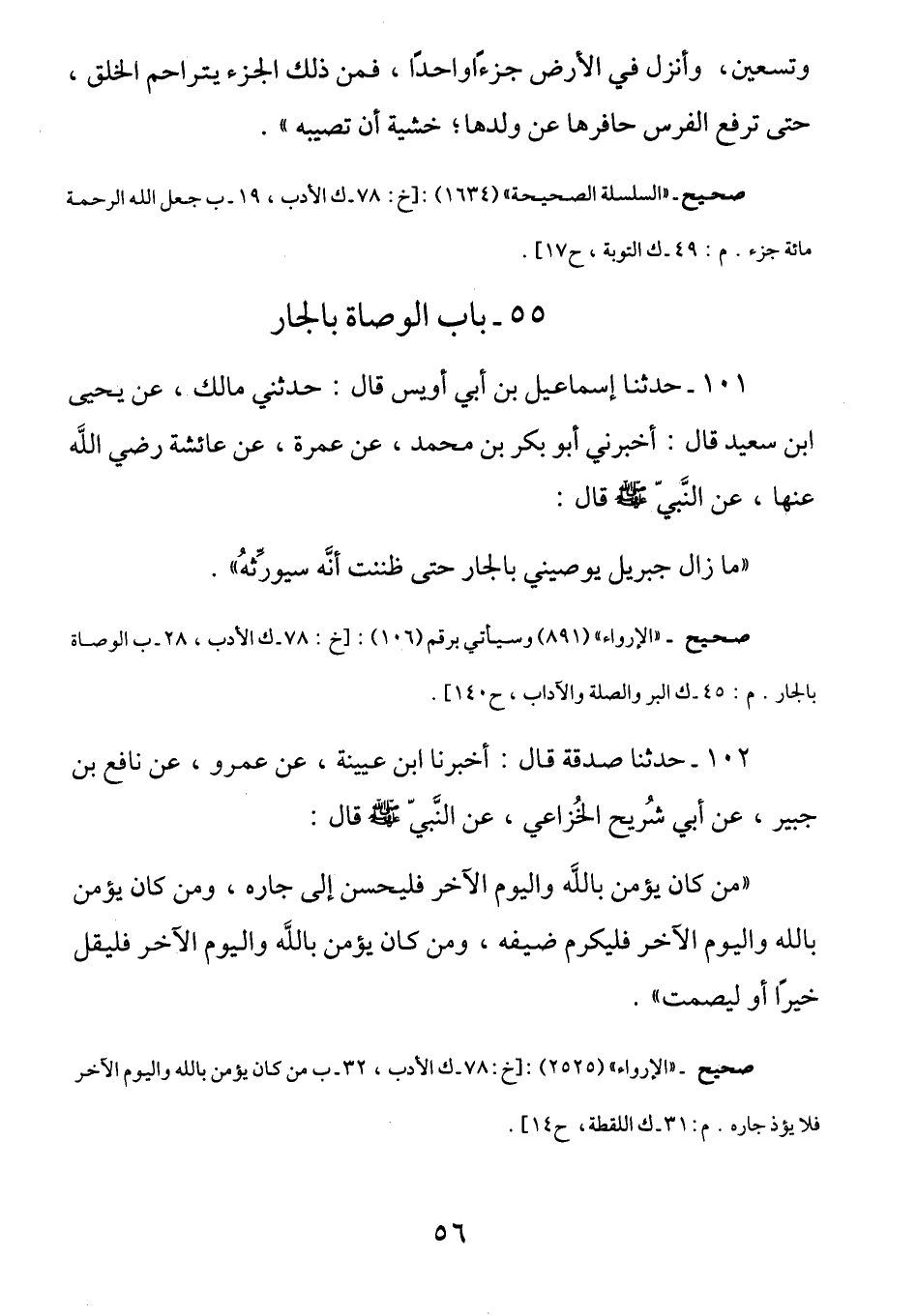 101 - عَنْ عَائِشَةَ رَضِيَ اللَّهُ عَنْهَا عَنِ النَّبِيِّ صَلَّى اللهُ عَلَيْهِ وَسَلَّمَ قَالَ: (مَا زَالَ جِبْرِيلُ - صَلَّى اللهُ عَلَيْهِ وَسَلَّمَ - يُوصِينِي بِالْجَارِ حتى ظننت أنه سَيورِّثُهُ) .