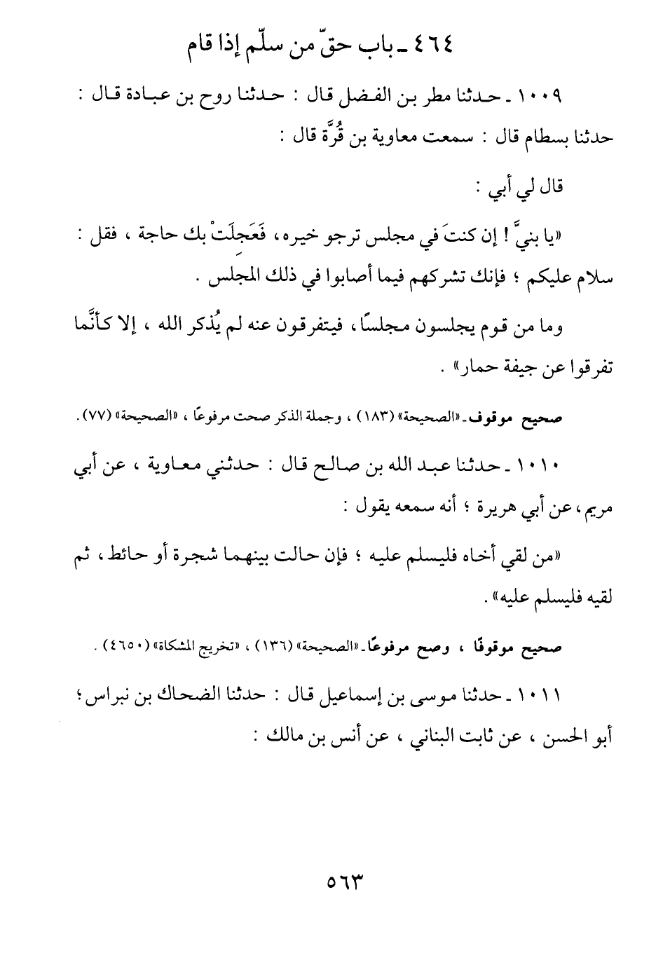 1010 - (ث 238) عن أبي هريرة رضي الله عنه أَنَّهُ سَمِعَهُ يَقُولُ: (مَنْ لَقِيَ أَخَاهُ فَلْيُسَلِّمْ عَلَيْهِ فَإِنْ حَالَتْ بَيْنَهُمَا شَجَرَةٌ أَوْ حَائِطٌ ثم لقيه فليسلم عليه)