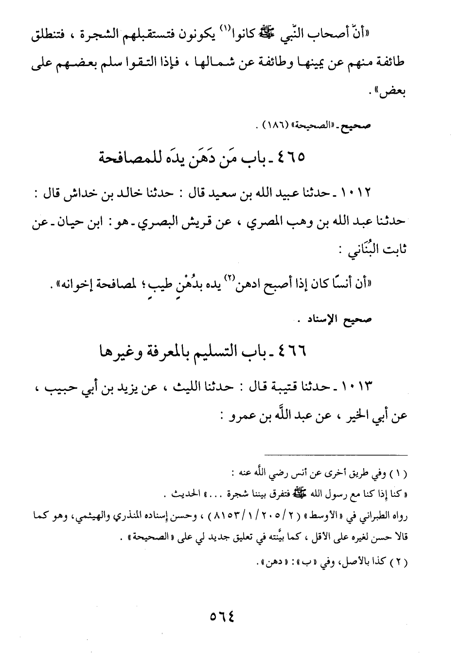 1012 - (ث 239) عَنْ ثَابِتٍ الْبُنَانِيِّ أَنَّ أَنَسًا كَانَ إِذَا أصبح دهن يَدَهُ بِدُهْنٍ طَيِّبٍ لِمُصَافَحَةِ إِخْوَانِهِ بَابُ التَّسْلِيمِ بالمعرفة وغيرها.