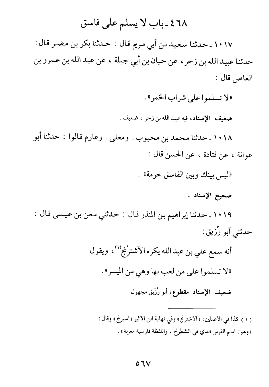 1017 - (ث 242) عَنْ عَبْدِ اللَّهِ بْنِ عَمْرِو بْنِ الْعَاصِ رضي الله عنهما قال: لا تسلموا على شراب الخمر.